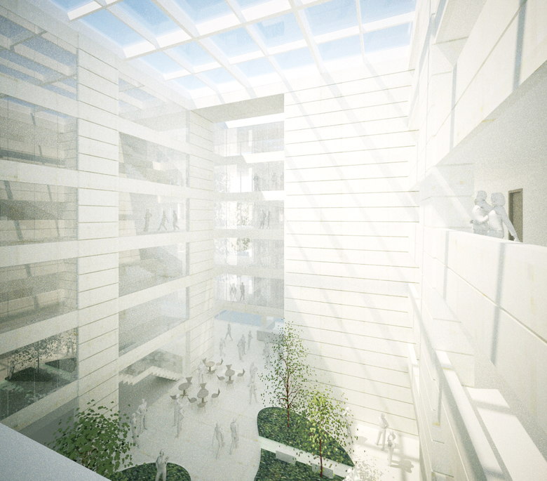 Die Entwurfsverfasser beantworten die Entwurfsaufgabe mit einem eleganten, unprätentiösen Kubus, der einerseits sein wesentlichen auf einen Raumtypus zugeschnittenes Nutzungsprofil und die flexible Aufteilung nach außen zeigt und sich andererseits in Richtung Westen zum Campus hin mit einer Geste öffnet, die Fern- und Nahwirkung in einem Fensterelement gestalterisch zusammenfasst.