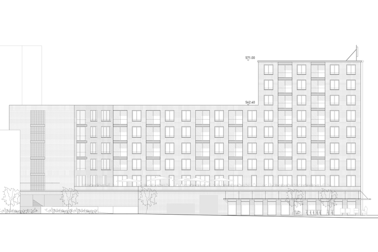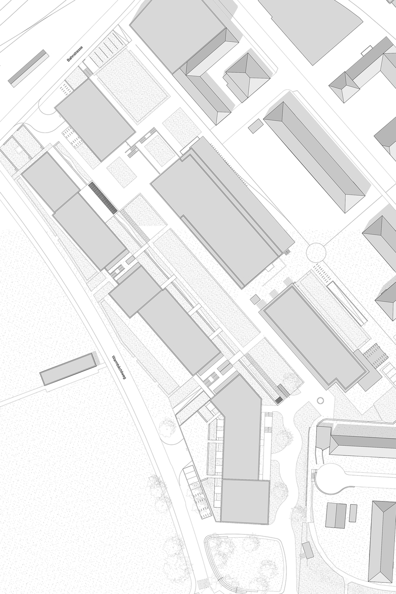In Anlehnung an die industrielle Vergangenheit entwickelt das städtebauliche Thema einfache, zusammenhängende Volumen. Der geknickte Baukörper reagiert auf die Erschliessungszone der Werkgasse und schafft volumetrisch einen klaren Auftakt zum Quartierplatz. Entsprechend der städtebaulichen Leitidee zeichnet der Rücksprung die Körperlichkeit der einzelnen Volumen aus und passt sich damit der Körnigkeit der benachbarten Bauten an.