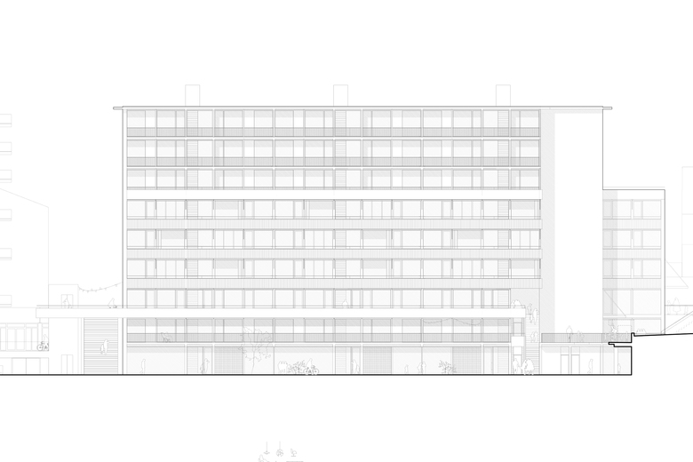 An der südöstlichen Ecke am Quartierplatz und zur Werkgasse ist das Café als Treffpunkt der Haus- und Quartierbewohner platziert. Über ein halbes Niveau sind die Waschküche und eine Velowerkstatt direkt mit dem Café verbunden und schaffen eine atmosphärische Durchmischung. Die gemeinsamen Waschküchen werden von jedem Treppenhauskern über einen internen Korridor erschlossen. Entlang der Ostfassade begleiten unterschiedliche Ateliernutzungen den Zugang zum Quartier und zum Gebäude. Dadurch entstehen neue Orte der Begegnung und der Identifikation.