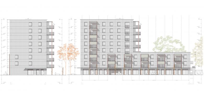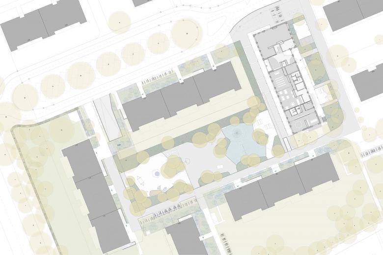 Der achtgeschossige Gebäudeteil an der Pestalozzistrasse markiert den Hauptzugang zur Siedlung, der neu über den Innenhof führt. Wo heute noch Parkplätze sind, entsteht ein neuer Aussenraum für alle. Das Erdgeschoss des Neubaus orientiert sich zum neuen Zugangsweg und zum gemeinsamen Hof. Eine flexible Gewerbefläche befindet sich direkt an der Pestalozzistrasse. Das neue Siedlungs-Bistrot belebt den Hof und kann mit dem angrenzenden Gemeinschaftsraum und der vorgesehenen kleinen Kita kombiniert werden.