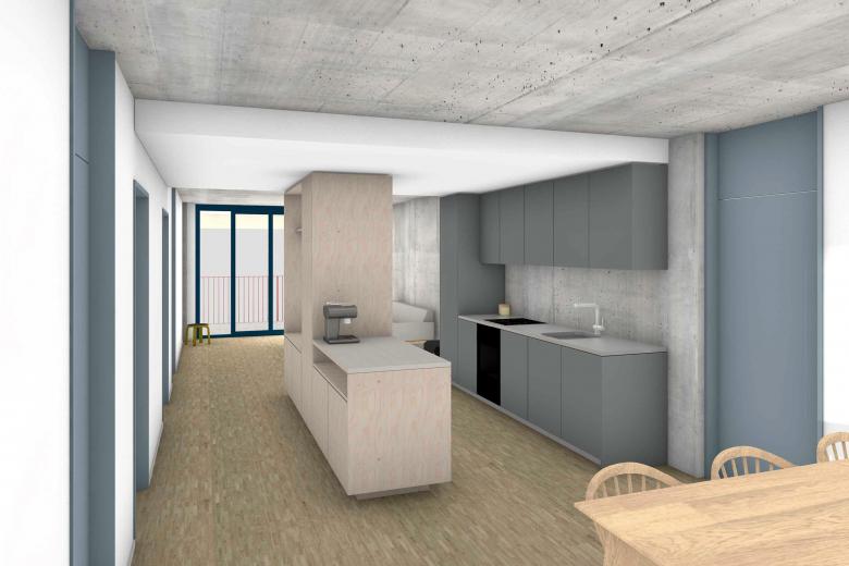 Die Erschliessung der Wohnungen ist ein Hybrid aus Laubengang und Punkterschliessung. Beim dreigeschossigen Gebäudeteil führt auf der Ostseite entlang dem Quartierweg ein Laubengang mit Aussentreppe zu den Wohnungen im 1. und 2. Obergeschoss. Die Wohnungen im achtgeschossigen Kopf werden durch ein Treppenhaus mit Lift erschlossen, welches jeweils auch zum Laubengang führt. Es entsteht eine spannende Erschliessungsfigur, welche im Erdgeschoss hofseitig an den neuen Siedlungszugang und rückseitig an den Quartierweg angebunden ist. Vom Laubengang her sind auch drei Ateliers zugänglich, welche als Joker- oder Ferienzimmer von allen Siedlungsbewohner*innen dazu gemietet werden können.