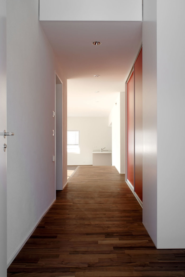 Über eine leicht ansteigende Rampe erreicht man den Zugang zum Wohnhaus. Parallel dazu ist die Abfahrt in die Garage im Untergeschoss. Eine massive Betonscheibe übernimmt die Funktion einer räumlichen Trennung zwischen Aussenraum und Erschliessung. Der Eingangsbereich des Wohnhauses öffnet sich über zwei Geschosse. Hier findet sich das zweigeschossige Garderobenmöbel mit dahinter liegendem Treppenaufgang ins Obergeschoss.