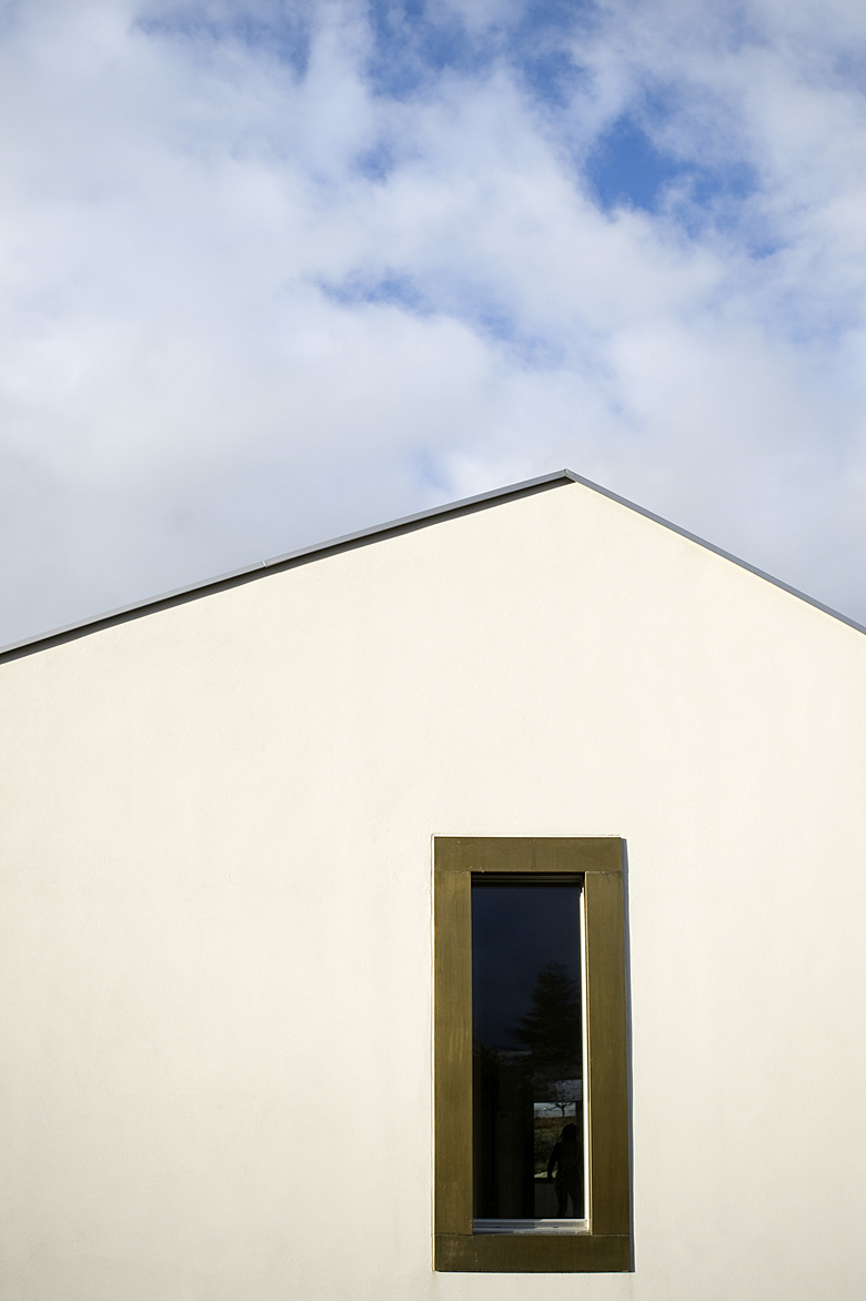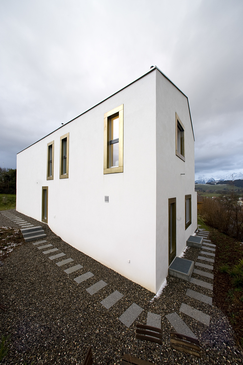 Das Bauvolumen wurde mit einer Aussendämmung und feinem Aussenputz versehen. Das Gebäude wird von zwei Öffnungstypen charakterisiert: dem quadratischen Lochfenster im Bereich der Wohn- und Schlafräume und den stehenden Fenstern in den Nebenräumen. Einzige Ausnahme bildet die Ausstülpung auf der Südseite, welche einen gezielten Ausblick auf das Panorama der Berner Alpen freigibt. Die Öffnungen sind mit Messing-Zargen gerahmt, welche zur weissen Fassade kontrastieren und das Gebäude kleiner wirken lassen, als es ist.