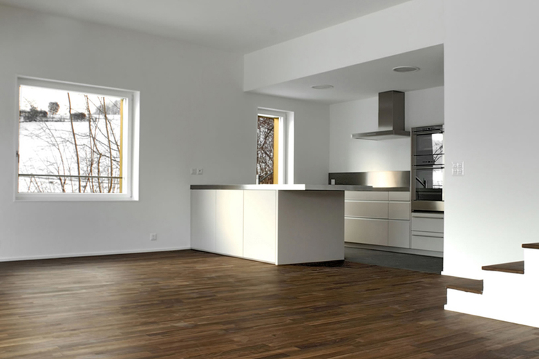 Vorbei an Büro und Bad, gelangt man über eine Niveautreppe in den Wohn- und Essbereich. Mit der Überhöhung des Wohnraums wird auf die bestehenden Terrainverhältnisse reagiert. Eine grosszügige Fassadenöffnung im Wohnbereich gibt den Blick auf die Berner Alpen frei. Im Obergeschoss befinden sich Schlaf-, Nass- und Nebenräume. Der eingezogene Balkon im Elternschlafzimmer bietet Raum, um sich zurückzuziehen. Die Teilung der Kellerräume wird flexibel gehalten, um den späteren Ausbau zu einer Wellnesszone zu ermöglichen.