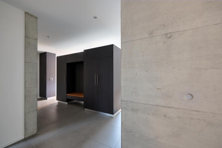 einflüssen. Angrenzend an den Eingangsbereich wurde ein einfacher Betonkörper für Aussengeräte und -mobiliar erstellt. Das grosszügige Vordach bietet Platz für einen Autoabstellplatz und Veloabstellplätze. Der Aussenraum wird durch die Bewohner genutzt; Zonierungen lassen einen Übergang vom öffentlichen zum privaten Raum entstehen. Die Abgrenzung des Privatbereichs der Erdgeschosswohnung erfolgt über die Gestaltung der Beläge und Niveauversätze. Ein Wasserbecken mit Grasbepflanzung wurde als weiteres Gestaltungselement auf der Westseite ausgeführt.
