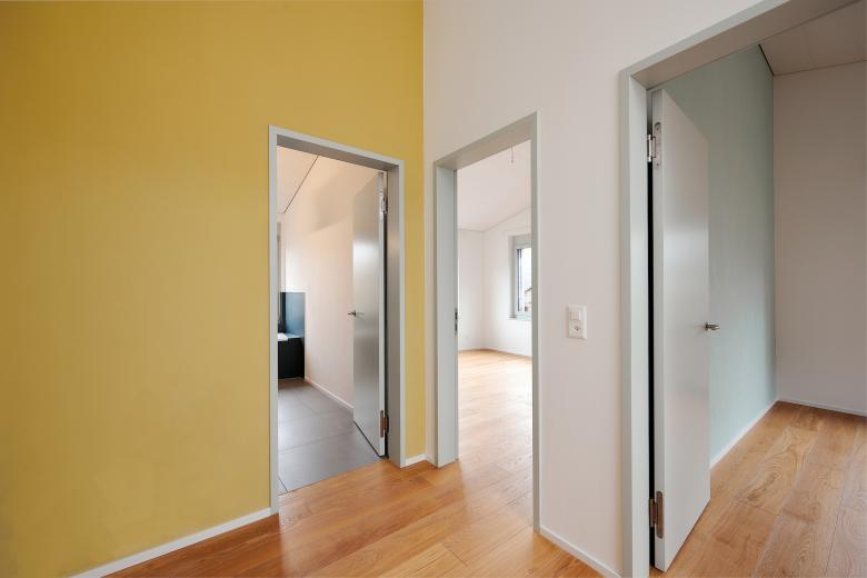 Die Wohnungen sind mit flexiblen, nutzungsneutralen Grundrissen ausgeführt, die Individualzimmer verfügen jeweils über eine Fläche von rund 14m2. Beide Einheiten haben mindestens einen privaten Aussenraum erhalten. Die Orientierung erfolgt auf mindestens zwei Wind-