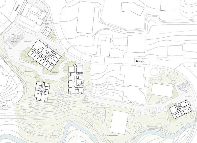 Nahe am Bären wird ein zurückhaltender Flachdachbau gesetzt, er funktioniert als Zentrum für den gesamten Betrieb. Östlich davon wird ein grösseres Volumen (Haus Bärenstutz) gesetzt, welches sich an den Bauernhäusern orientiert. Südlich wird ein weiteres, kleineres Volumen (Haus Hohle) an den Hang platziert. Angelehnt an das Bauernwohnhaus treten die beiden Volumen als Holzbauten mit Satteldach in Erscheinung. Das bestehende Parkdeck wird abgebrochen und durch ein neues Volumen (Haus Mühle) ersetzt. Der Bau klärt den Strassenverlauf und korrespondiert mit der Mühle. Als Ausläufer der Bahnhofstrasse werden im Erdgeschoss Dienstleistungsbetriebe untergebracht. Grünflächen und der Verzicht auf oberirdische Verbindungsbauten unterstreichen die Erscheinung der Bauten als Solitäre.