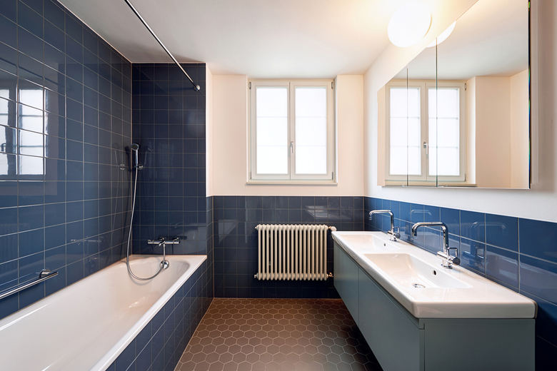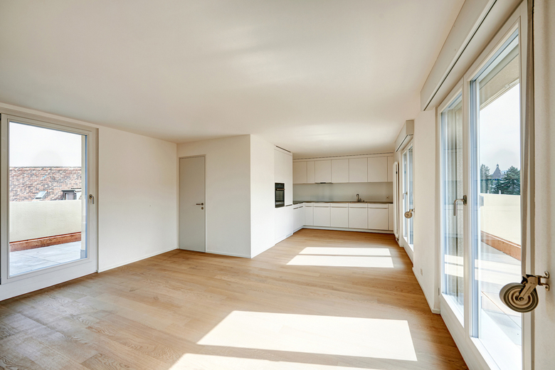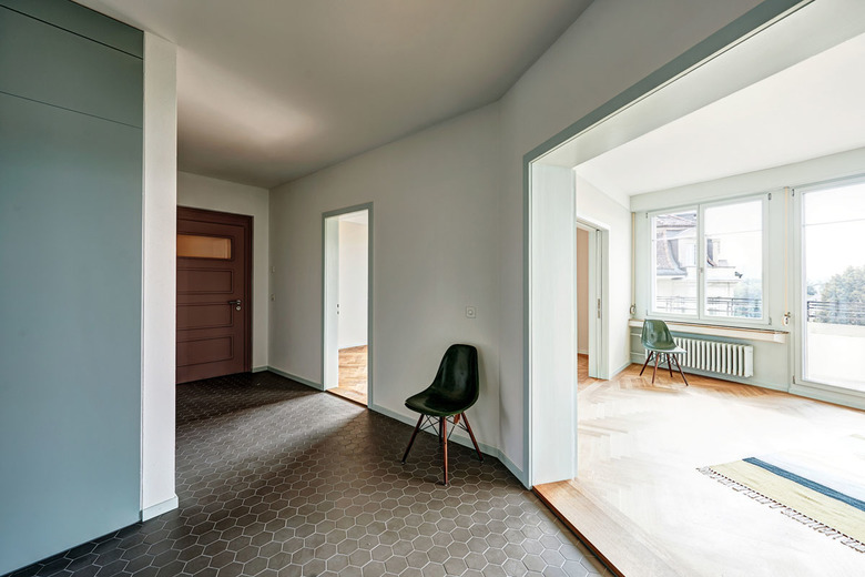 Sorgfältig wurden die Oberflächen auf ihre ursprüngliche Materialität und Farbigkeit untersucht. Wo immer möglich wurden die originalen Bauteile restauriert und weiterverwendet. Kleine Details zeichnen den Umgang im Bestand aus – so wurde zum Beispiel die in der Schaufensterfront integrierte Ausstellstore im Gewerberaum repariert, fehlende Teile nachgebaut und der Antrieb wieder gangbar gemacht. Die wiedergewonnene Farbigkeit im Treppenhaus und in den Wohnungen, die feine farbliche Zäsur in den Wohnräumen, sowie die Wahl der keramischen Oberflächen folgen dem entwickelten Sanierungskonzept. Hofseitig erhalten die Wohnungen grössere Balkone, welche den Ausdruck des Gebäudes aufnehmen. Das Attikageschoss erfährt eine grundlegende Erneuerung. Das architektonische Konzept verfolgt eine klare Trennung zu den Regelgeschossen und bildet den neu gewonnenen Wohnraum formal als Neubau ab.