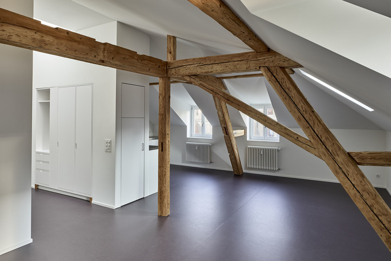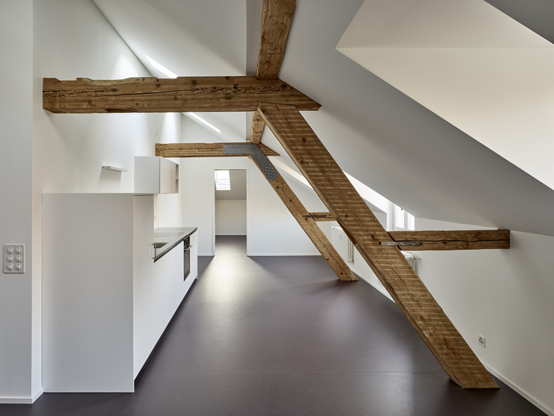Auf Basis historischer Pläne rekonstruierten wir die ursprüngliche Grundrisstypologie: Auf der Eingangsseite waren Nasszelle und Küche angeordnet, gegen die repräsentative Südseite die Wohn-, Arbeits- und Schlafräume. Wir wollten das Gebäude in seine ursprüngliche Struktur zurückzuführen. Der Küchenanbau sowie kleinteilige Einbauten entfernten wir. Mit einer sorgfältigen Spurensuche fügten wir historische Fragmente zusammen und es zeigte sich immer deutlicher ein Gesamtbild des einstigen Zustandes. Die Eingriffe in den drei Wohngeschossen ordnen sich in die historische Architektursprache ein, neue Raumsequenzen werden analog den Bestehenden miteinander verbunden. Bestehende Bauteile wurden repariert und weiterverwendet oder mit handwerklicher Raffinesse wieder hergestellt. Das grossräumige Dachgeschoss gewährte ideale Voraussetzungen für den Einbau von zwei kleineren Wohnungen. Die Eingriffe heben sich deutlich vom Ursprünglichen ab, schaffen aber mit dem sichtbaren Gebälk den historischen Bezug.