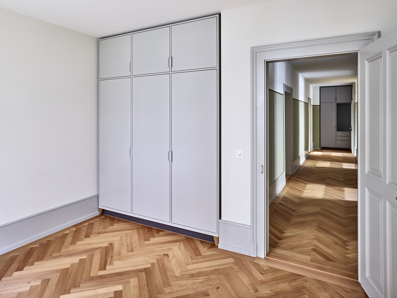 Verschiedene Holz- und Verlegearten von historischen und rekonstruierten Parkettböden und ein durchlaufender Fussladen führen zu einer atmosphärischen Raumstimmung. In Anlehnung an die teilweise vorgefundenen, sechseckigen Zementplatten wurde in den Nassräumen der neue Boden verlegt. Diverse Schichten von Tapeten zeugten wie Jahrringe von mehrfachen Sanierungen und wurden bis auf die Grundstruktur zurückgebaut. Hinter nachträglich eingebauten Schränken fanden wir aufschlussreiche Erkenntnisse zur ursprünglichen Farbigkeit. In Zusammenarbeit mit Denkmalpflege und Restaurator erstellten wir so ein durchgängiges Farbkonzept. Neue Einbauten reihen sich in diese Farbigkeit ein, heben sich aber durch ihre Gestaltung differenziert ab.