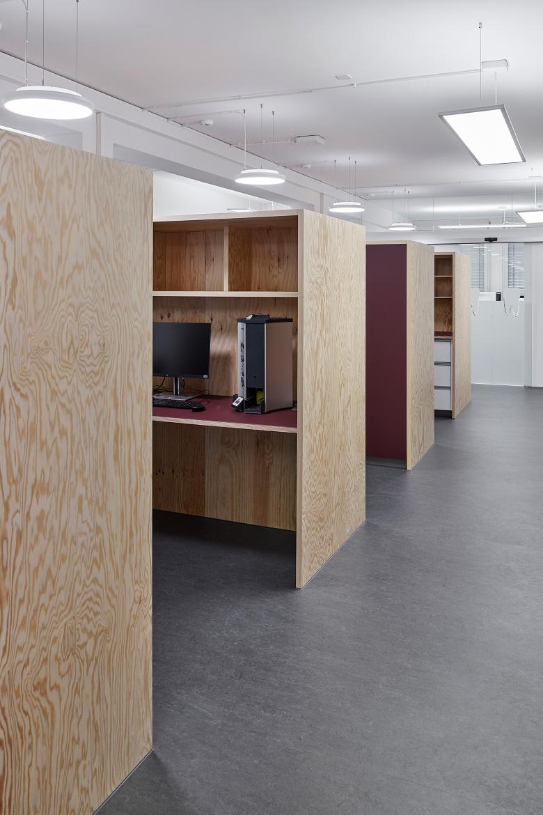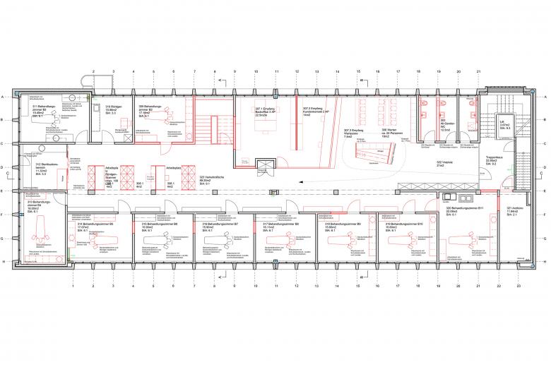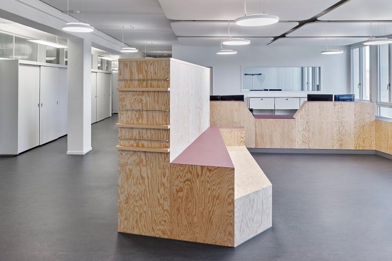 Für den SZMD haben wir die Grundrisse des Dachgeschosses und des 3. Obergeschosses neu organisiert. Was vom Bestand noch gut war, wurde geschützt und blieb drin. Wände, Türen, Einbauschränke und Bodenbeläge wurden erhalten, aufgefrischt und mit neuen, gleichartig gestalteten Elementen ergänzt. Weiter haben wir Teile aus dem Breitenrain an der Frankenstrasse wieder verwendet (Behandlungsstühle, technische Geräte, Küchengeräte, eine Glasschiebetüre und 33 Garderobenschränke). Seekiefer als Material für die neuen Einbauten prägt die Stimmung im Innern und schafft Einheit in der Vielfalt von Bestand, Re-Use und Neuem. Die Seekiefer mit ihrer warmen Holzoberfläche und der kräftigen Maserung generiert eine Identität, die im klinischen Umfeld überrascht und möglichst einfach und zugänglich wirken soll.