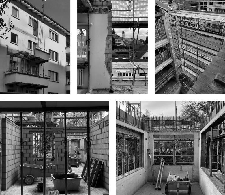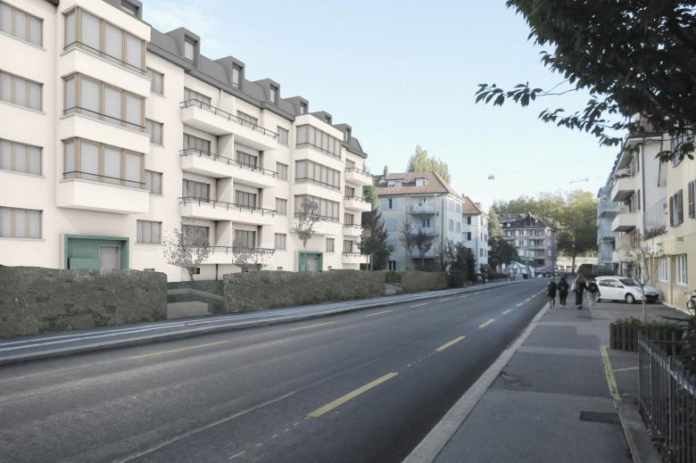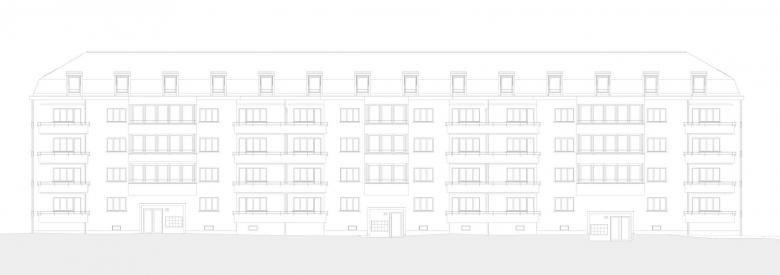Die Wohnungsanzahl wird von 32 auf 39 erhöht, der Wohnungsmix insbesondere bei Klein- und Familienwohnungen erweitert und die Hauptnutzfläche um beinahe 30% erhöht. Das Dach wird mit PV-Panels gedeckt, ein Dämmputz verbessert die Gebäudehülle energetisch, ohne den Charakter der Zeile zu verändern. Die neuen Elemente wie Erker und Balkone verbinden sich auf selbstverständliche Weise mit dem Bestand.