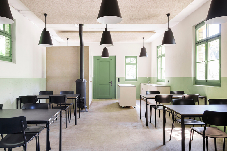 Die Untersuchung der bestehenden Fenster und der Eingangstüre brachte einen kräftigen Grünton als ursprüngliche Farbe ans Licht. Dieser Farbton prägt zusammen mit dem farblich angepassten Sockel im Innern das neue Raumgefühl. Bewusst verzichten wir auf schulungsraumtypische Elemente im Ausbau. Sowohl die eigenständige, dimmbare Beleuchtung als auch die Möblierung assoziiert man eher mit Bildern eines Ateliers oder einer Werkstatt. Für die Kinder soll der Besuch des Angebots der Gartenpädagogik zu einem speziellen Erlebnis werden.