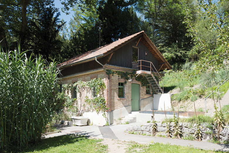 Das Fischereihaus wurde 1907 als Fisch-Bruthäuschen mit einem pavillonartigen Flachdach erstellt. Bereits vier Jahre später wurde der Bau mit einem Satteldach aufgestockt und das Haus erhielt seinen heutigen Ausdruck. Die ursprünglichen Dachränder an der Fassade deuten noch auf die anfängliche Volumetrie hin. Das Haus litt jahrelang unter Feuchtigkeitseinflüssen durch das Hangwasser des Aarehangs. Für die neue Nutzung entwickelten wir zusammen mit dem Planungsteam eine Lösung, um die Feuchtigkeit aus dem Innern fernzuhalten: Eine neue Betonbodenplatte und eine hangseitige Betonwand dichten das Gebäude gegen die Feuchtigkeit ab. Der Ausbau ist bewusst einfach gehalten. Der neue Betonboden als Dichtigkeitsebene ist gleichzeitig der fertige Bodenbelag. Den Beton bearbeitete der Baumeister, wie man es aus alten Waschküchen kennt, während dem Abbindeprozess mit einer Metallwalze. Die dadurch leicht strukturierte Oberfläche wurde anschliessend mit einem Steinöl behandelt. Eine einfache Werkküche und eine Kochstelle auf Rollen lassen sich für die Gartenpädagogik flexibel nutzen. Der restaurierte Zylinderofen aus dem Jahre 1920 ergänzt die Ausstattung des Innenraums. Die alten Fenster tragen zum Charme des Fischereihauses bei, diese haben wir erhalten und restauriert.