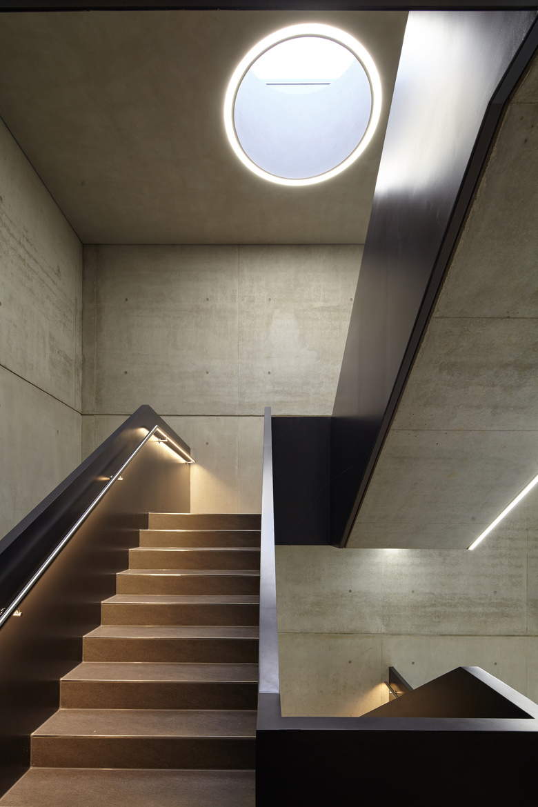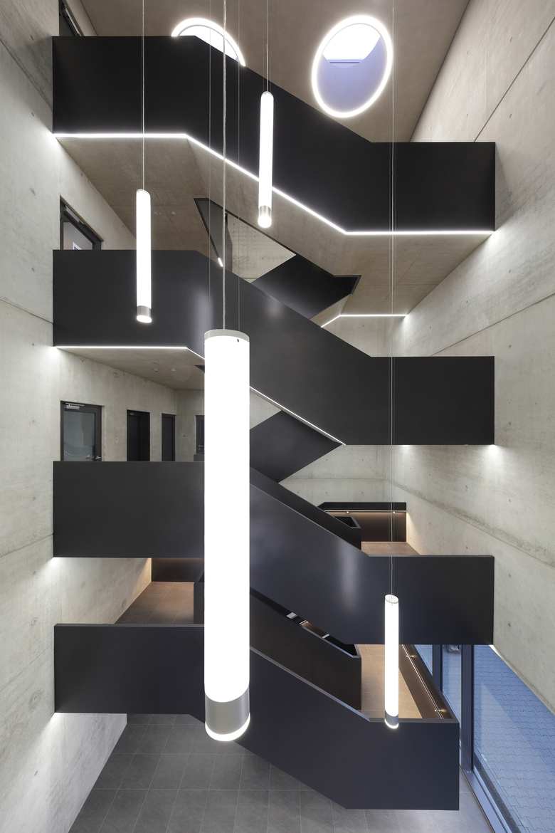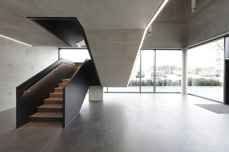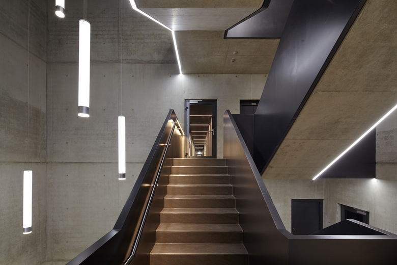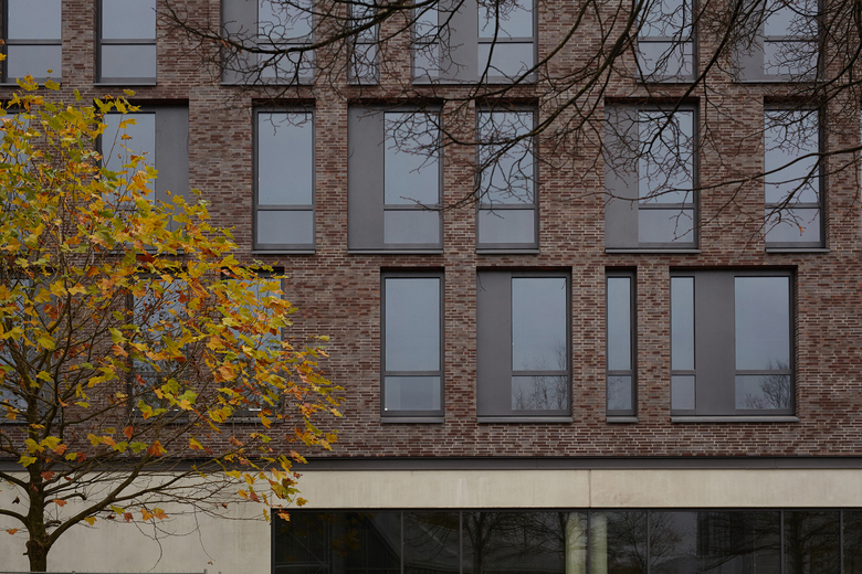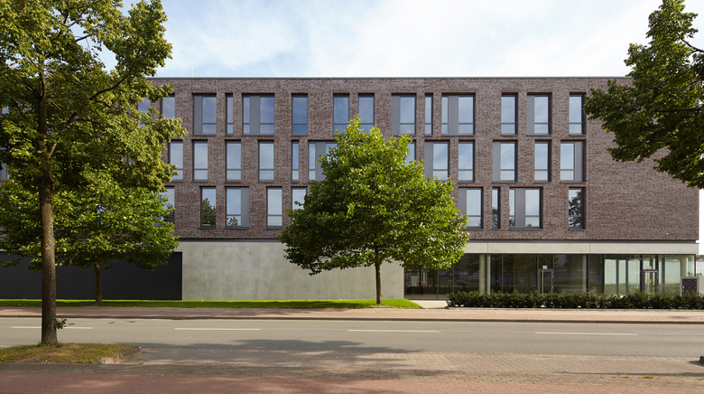 Die Fassade des Gebäudes ist unterteilt in eine Erdgeschosszone aus Sichtbeton und den darüber liegenden Geschossen aus gebranntem Klinker. Sie bildet damit die unterschiedlichen Funktionen auch nach außen hin ab. Mit der Wahl eines Klinkers nimmt das Gebäude Bezug auf die Geschichte des Ortes. Der ehemalige Schlachthof, die heute von der Fachhochschule genutzte frühere Kaserne, die Seidenstickerhalle sowie die Feuerwache, die sich in der näheren Umgebung befinden, sind allesamt Klinkerbauten, die das Quartier seit vielen Jahren prägen. Auch damit möchte das Gebäude einen Beitrag zur architektonischen Konsolidierung des Quartiers beitragen.