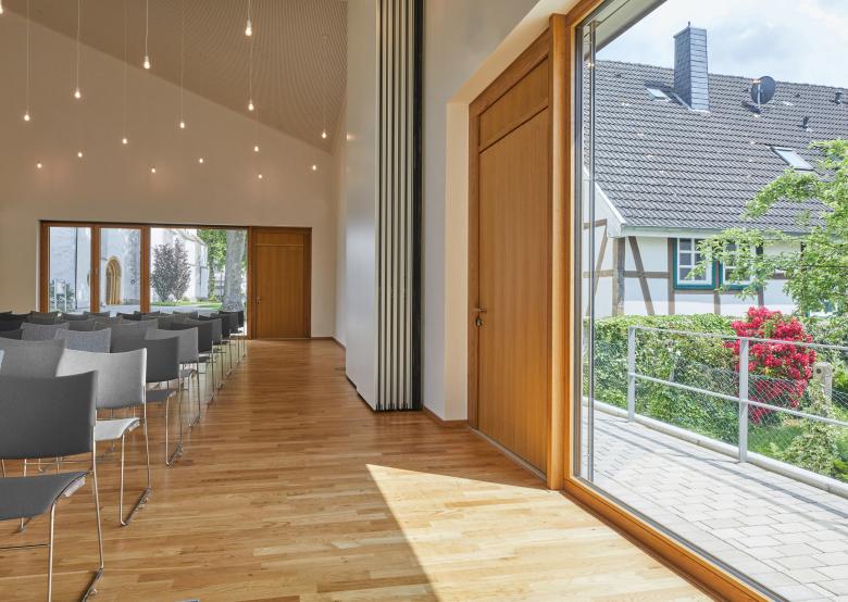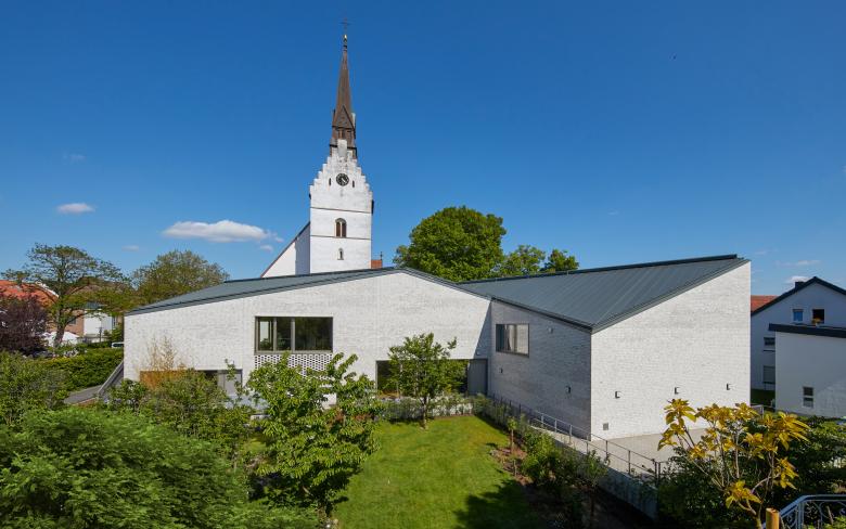 Das neue Gemeindehaus gliedert sich in zwei Baukörper, die durch ein zweigeschossiges Foyer miteinander verbunden sind. Der südliche Baukörper springt gegenüber der Straßenflucht zurück, wodurch ein kleiner Platz herausgebildet und das Kantorhaus städtebaulich hervorgehoben wird. Er dient als Vorplatz zum Gemeindehaus und bietet Raum für Veranstaltungen der Kirchengemeinde im Freien. Westlich des den Gemeindesaal beinhaltenden Baukörpers wird die verbliebene Grundstücksfläche Garten des Kantorhauses. Die durchgängige Dachlandschaft erlaubt die räumliche Verbindung des im Obergeschoss angeordneten Jugendcafés mit dem Foyer. Dabei entsteht ein Innenraum voll spannender Blickbeziehungen und hohem Erlebniswert. Auch die äußere Gestaltung des neuen Gemeindehauses orientiert sich an der umliegenden Bebauung. Für die Außenwände des Gebäudes wird ein zweischaliges Mauerwerk vorgeschlagen, dessen Oberfläche mit einem mit einem Schlämmputz behandelt wird. Als Dacheindeckung sollen matte rote Tonziegel eingesetzt werden.