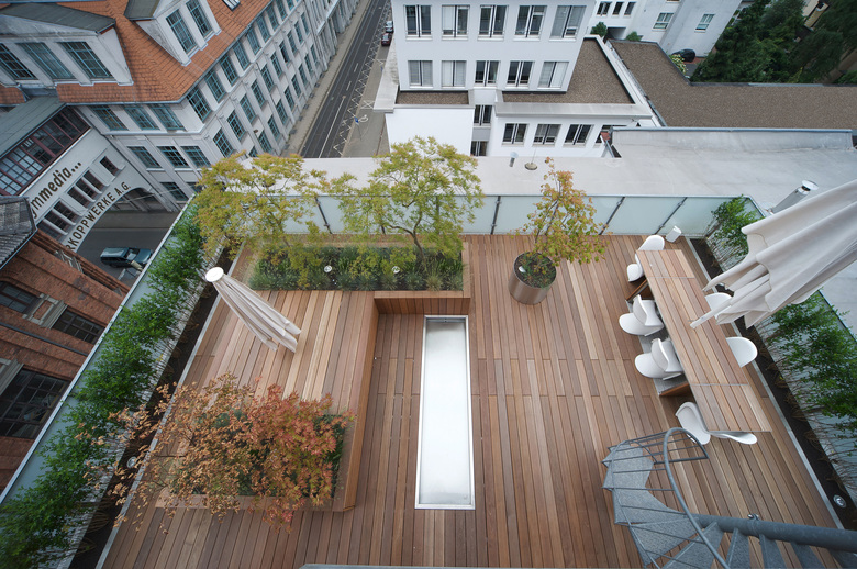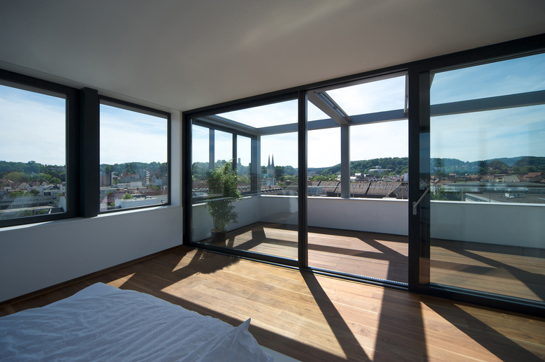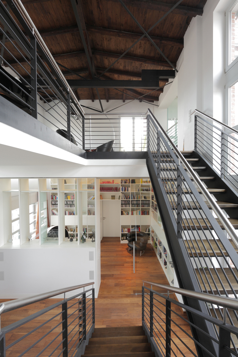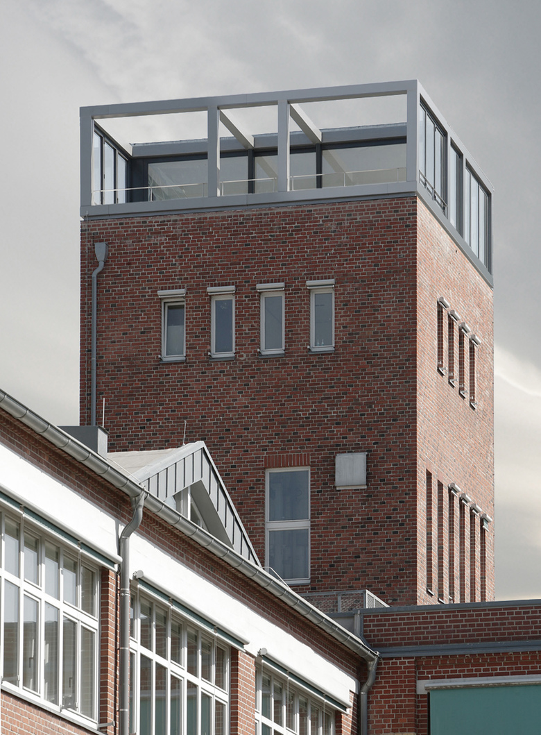 Da der Bedarf nach zusätzlichen Räumen nicht allein durch Veränderungen im Grundriss befriedigt werden konnte, wurde der Turm um eine Etage aufgestockt. Das neue Geschoss setzt sich architektonisch bewusst vom Bestand ab. Der transparente Körper aus Glas und Aluminium bildet einen Kontrast zur Lochfassade der historischen Backsteinarchitektur. Eine kleine Schattenfuge trennt die Aufstockung vom Bestand. Durch das Aufgreifen vorhandener Farben werden Bezüge zum Bestehenden hergestellt und die architektonische Integration erleichtert.
