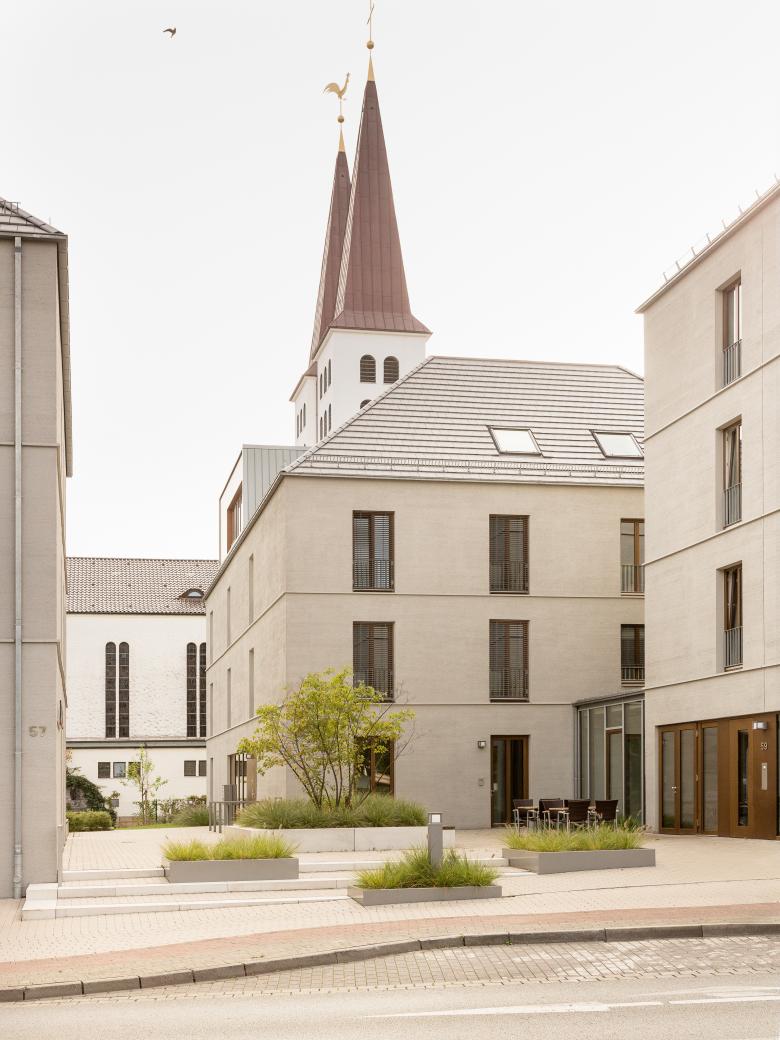 Durch die Anordnung der Baukörper konnten alle vorhandenen Bäume erhalten werden. Sie markieren den Anfang eines das Wohnquartier durchquerenden Grünzugs und tragen zur Bereicherung der Wohnqualität bei. Die Gebäude gruppieren sich um einen zur Oststraße hin offenen kleinen Platz, der als halböffentlicher Außenraum das Entree zu den einzelnen Häusern bildet. Hieran schließt im Osten ein Garten mit Kinderspielplatz an, der ausschließlich den Bewohnern zur Verfügung steht und durch seine Lage abseits der Straßen vor dem Verkehr geschützt ist. Der südliche und der östliche Baukörper sind im Erdgeschoss miteinander verbunden. Hier war ursprünglich eine Filiale der Volksbank vorgesehen, deren Realisierung aber im Laufe der Umsetzung des Projektes aufgegeben wurde. Jetzt ist im Eckgebäude eine Bäckerei untergebracht, die mit einer kleinen Außengastronomie den Vorplatz belebt. Auch in den Erdgeschossen des nördlichen und des östlichen Baukörpers sind kleinteilige gewerbliche Nutzungen untergebracht.