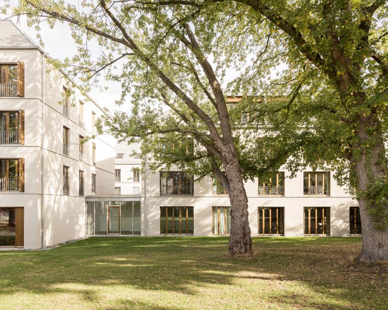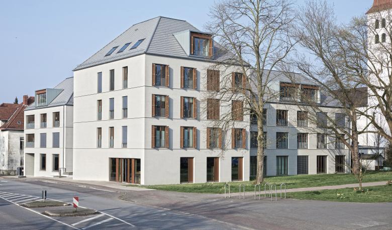 Die insgesamt 24 Wohneinheiten in den Obergeschossen der drei Häuser sind von unterschiedlicher Größe. Sie reichen von 60 bis 120 qm und sorgen für eine gemischte Bewohnerstruktur. Die erforderlichen Stellplätze befinden sich in einer Tiefgarage mit direkter Anbindung an die Treppenhäuser der drei Gebäude. Die Zufahrt in die Garage erfolgt direkt von der Oststraße.