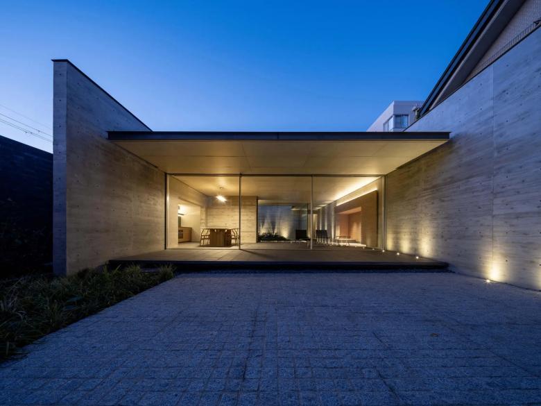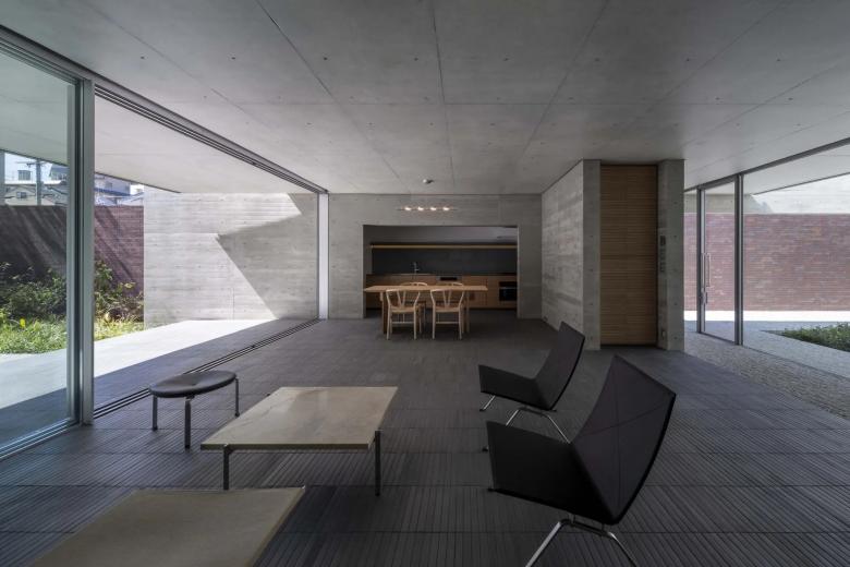 大都市の真只中、しかも前面道路に直接面していない奥まった場所にある変形の敷地という特殊な状況下に計画した、鉄筋コンクリート造で平屋の住宅である。したがってこの住宅にはファサードは存在しないし、一般的な建築の持つような「外観」はなく、内部空間とそこに光と風を導入するための「中庭」だけでこの住宅は出来上がっている。