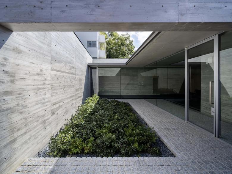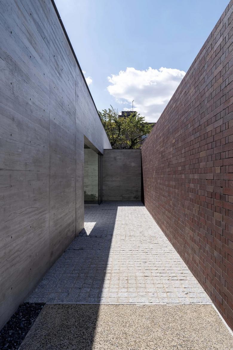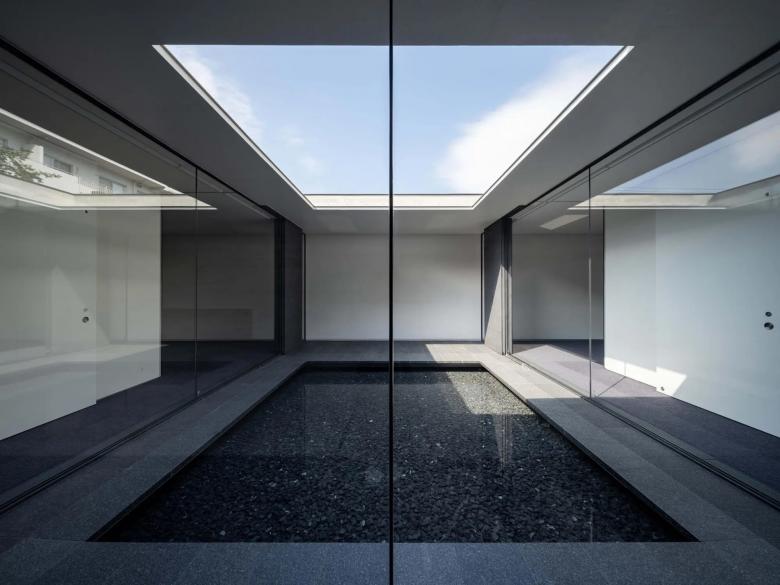 そのリビング・エリアの南側では、既存の樹木を当初から立っていた場所から動かさずに保存し、さらにこの場所に以前より建っていた建築の記憶として既存の建築の一本の柱を中庭の屋根を支える柱として保存活用するなど、この敷地の持っている歴史や場所性を見ることができるような、どちらかといえば物語性のある庭園を南側の中庭として計画した。北側のプライベート・エリアにはそれとは対照的に、矩形の黒い水面だけで構成した中庭を配置し、南側の緑や歴史を感じさせる具象的な中庭とは対照的な、水と光だけの抽象的な中庭の空間とした。