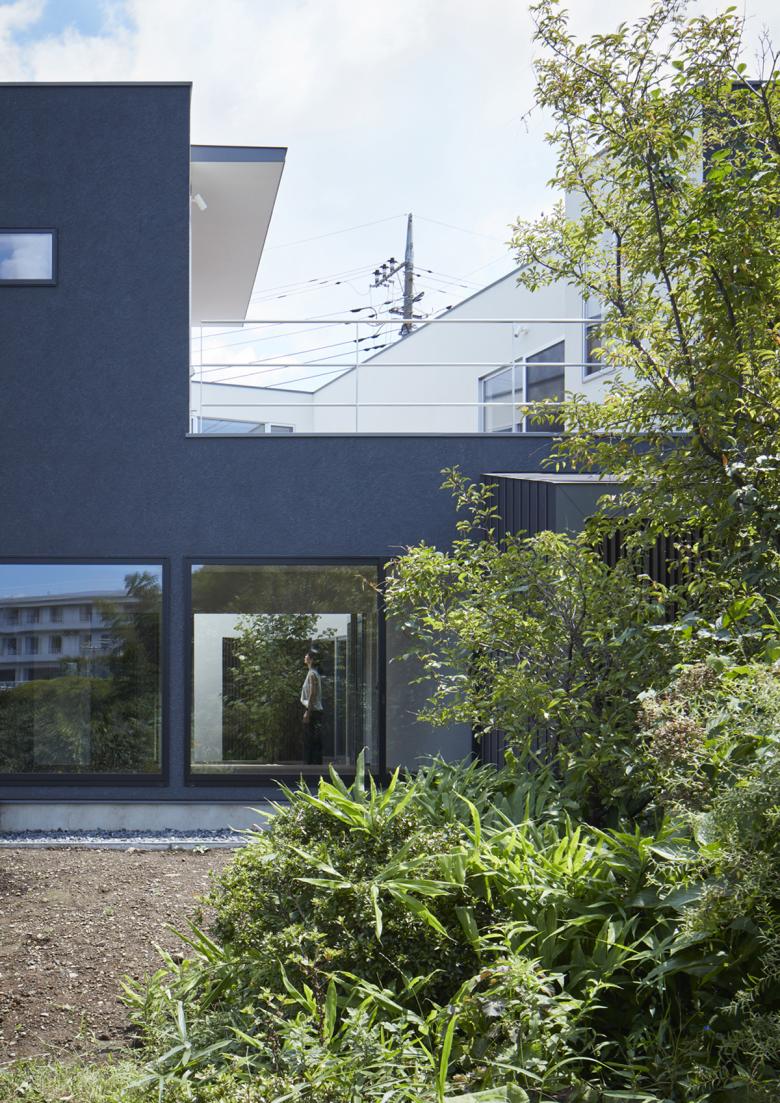 The site is located on a hillside in an urbanization control zone in the suburbs of Yokohama. The mother, three daughters, and several cats live in the parent household on the first floor, and the couple and their daughter live in the child household on the second floor. Only the entrance is shared, the rest of the house is completely separated. On the west side of the site, there is a natural forest-like garden with various trees, and there is a large persimmon tree by the entrance on the north side. We considered the layout of the building so as to leave those existing trees as much as possible. As the site was large (approximately 150 tsubo), a L-shaped plan with a courtyard at the center was considered appropriate to ensure privacy. However, a courtyard completely enclosed by a two-story building would feel claustrophobic, so we wanted to connect the courtyard to the surrounding environment. On the first floor, a two-car garage was built on the east side of the building, which can be accessed flat from the steep slope, and connected to the courtyard. The interior space is therefore U-shaped, opening to the east. On the second floor, a large terrace was built on one side of the west side, and the interior space is U-shaped, opening to the west, because the view extends to the west. The courtyard opens to the east on the first floor and to the west on the second floor, allowing light to enter and breezes to flow through, since there are openings in both directions. A 3-meter-high malva tree was planted there. The tree in the courtyard is the center of the house, where the two households can live as one.