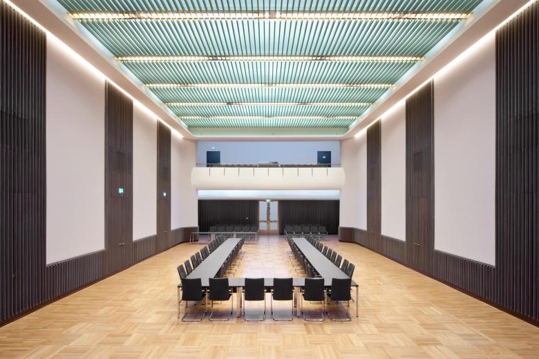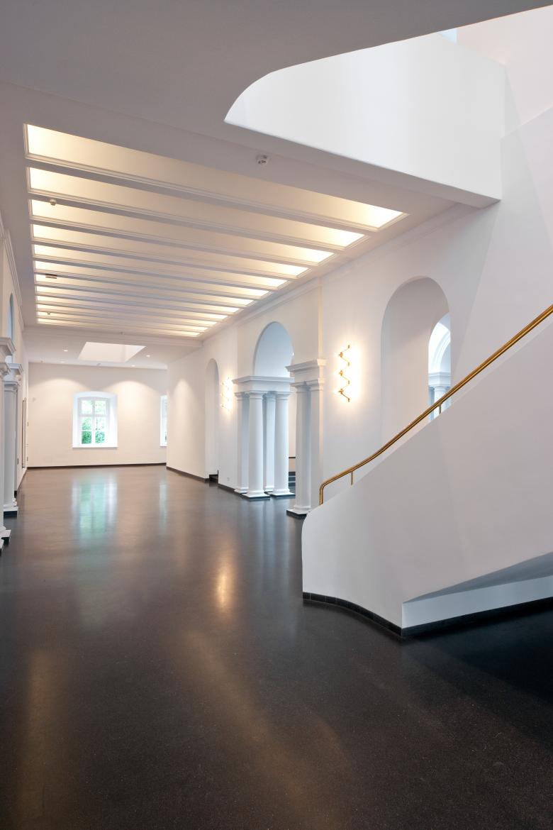 Die Gestaltung des zweigeschossigen Foyerbereiches vor dem Ständesaal sah den Rückbau von Einbauten aus den 50er-Jahren vor und stellte mit der Wiederöffnung des zentralen Lichthofes eine neue Raum-, Belichtungs- und Orientierungssituation her. Bei der Durchwegung des Ständehauses über den Haupteingang, durch das zentrale Foyer bis hin zum Ständesaal entsteht so eine spannende Raumfolge mit unterschiedlichen Belichtungssituationen, Blickbeziehungen, sowie vertikalen und horizontalen Raumbezügen. Die Gestaltung des Ständesaales lehnt sich dabei an das Konzept von Arnold Bode an, indem Farbfassungen, Materialien, Oberflächen und die Konstruktion des Oberlichtes wieder hergestellt wurden.