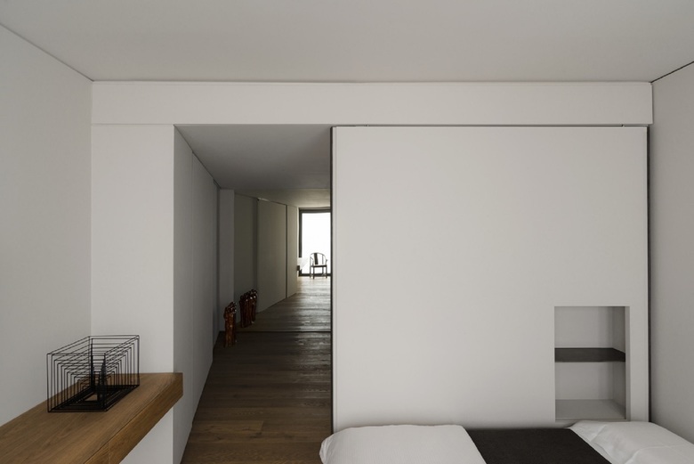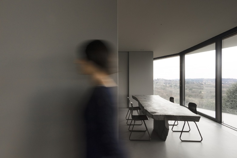 Ne consegue uno spazio fluido, continuo, senza interruzioni. I confini non sono definiti, gli spazi si trasformano seguendo i momenti ritmati della giornata. Grandi pannelli scorrevoli a tutt'altezza modulano stanze ideali, creano fessure di compagnia, di luce, di curiosità e quindi di gioco dinamico. Non volevamo dover far "chiudere una porta" per potersi isolare.