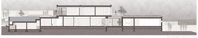 La centralità e l'individualità caratterizza al contrario il livello superiore della zona giorno che come un masso si appoggia sulla struttura sottostante ne rimane incastrato e diventa l'ingresso principale alla quota alta della strada. A questo livello gli spazi esterni riprendono l'andamento longitudinale; verso nord la piscina è ricavata nella sezione del muro a sasso, dal lato opposto si apre un ampio terrazzo sopra la copertura del garage.