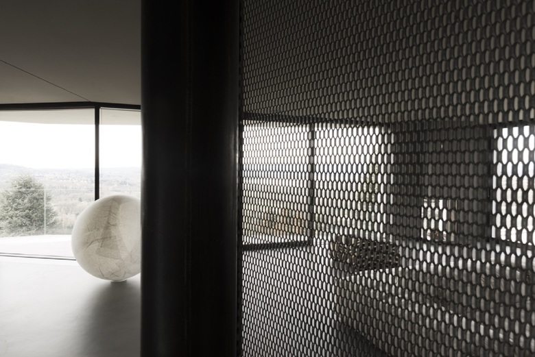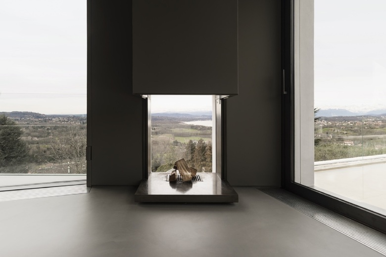 All'esterno in prossimità delle vetrate del soggiorno l'acqua della piscina riflette la variabilità del cielo. All'interno a breve distanza il fuoco di un braciere appoggiato a terra scalda e tiene compagnia nelle fredde giornate invernali.