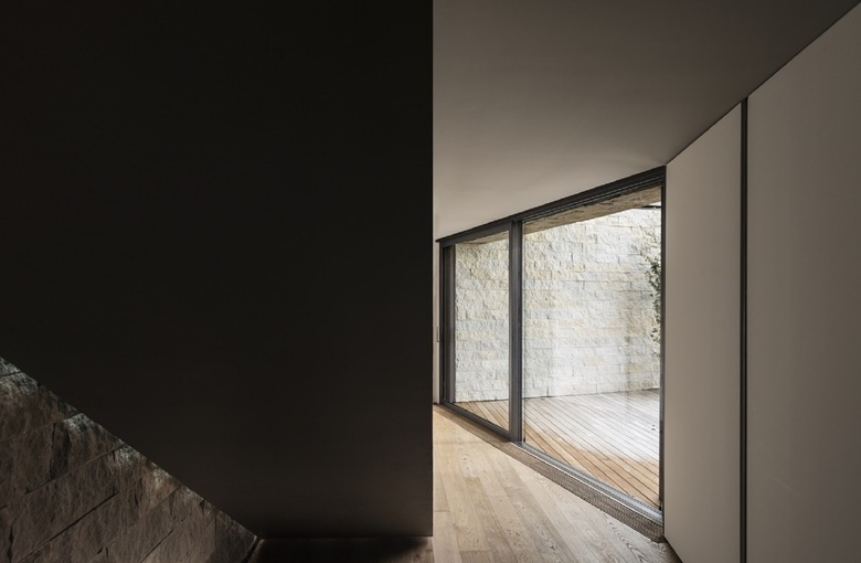 Da una parte ci sono grandi superfici vetrate che come un diaframma segmentato aprono la casa al paesaggio, dall'altra quinte di legno e nuclei funzionali interni ci portano dentro all'organismo, tracciando percorsi fluidi e continui che si affiancano alle vetrate per poi rientrare nella penombra degli spazi più interni.