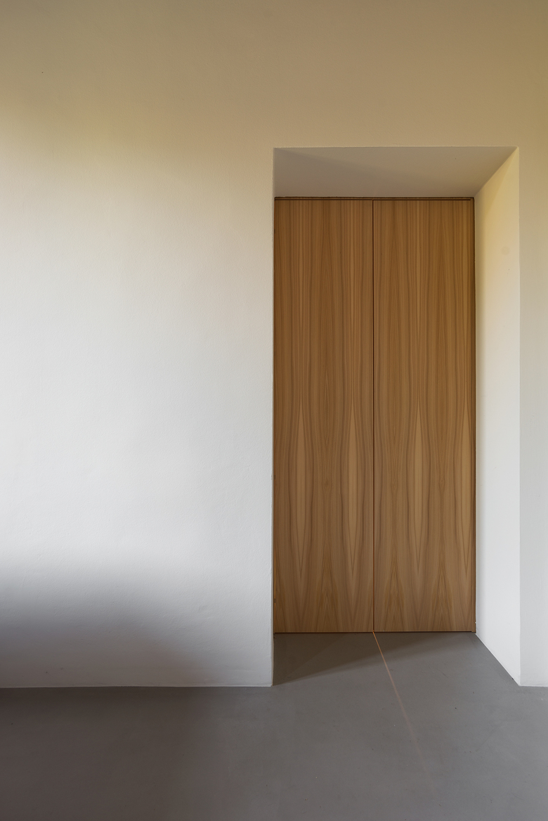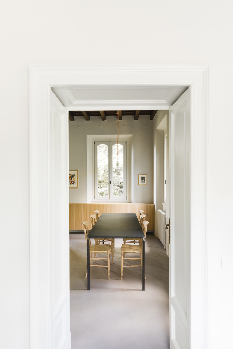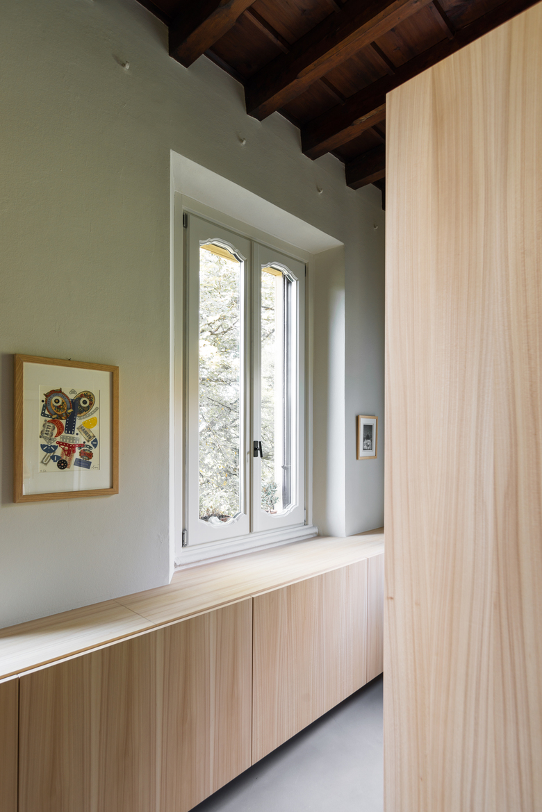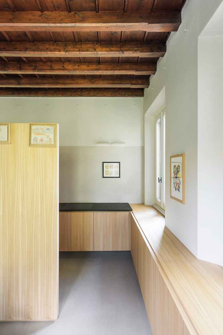 La morbida venatura verticale del legno di olmo ci accoglie all'ingresso. La ritroviamo poi nella biblioteca e nella cucina. Una materia bellissima e preziosa per il suo colore, per il suo disegno e per la sua età e di cui il cemento esalta la naturalezza.