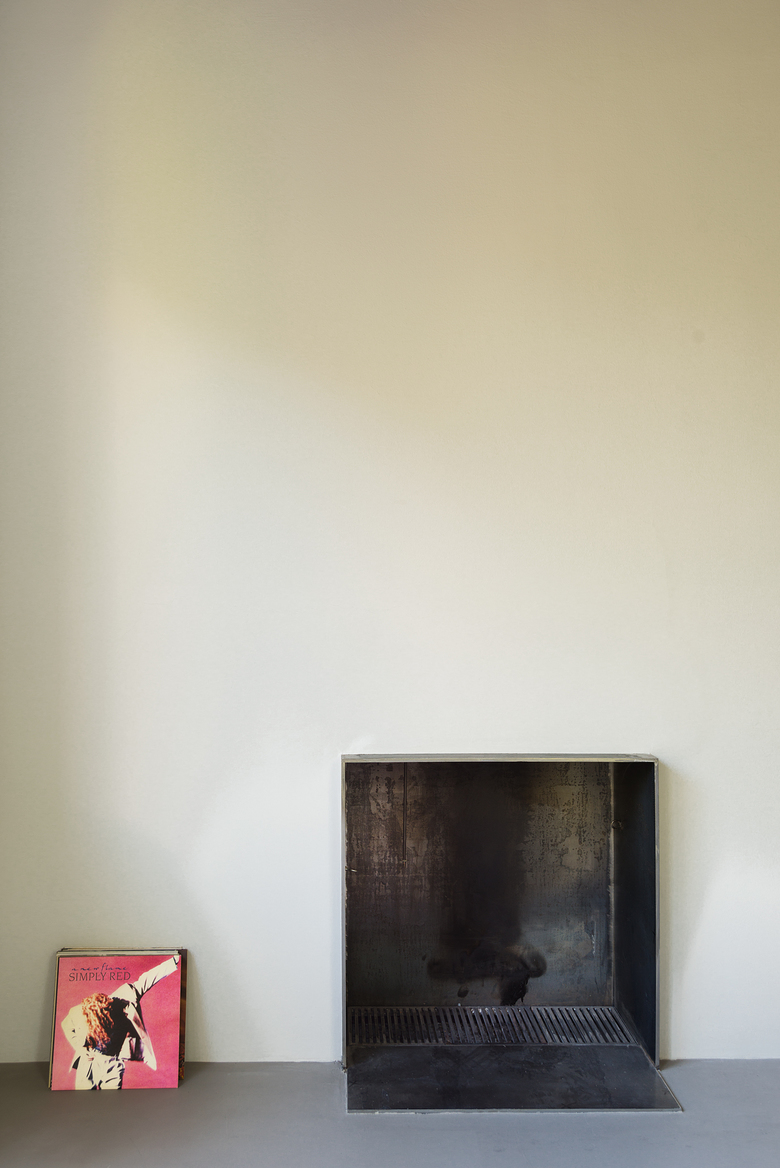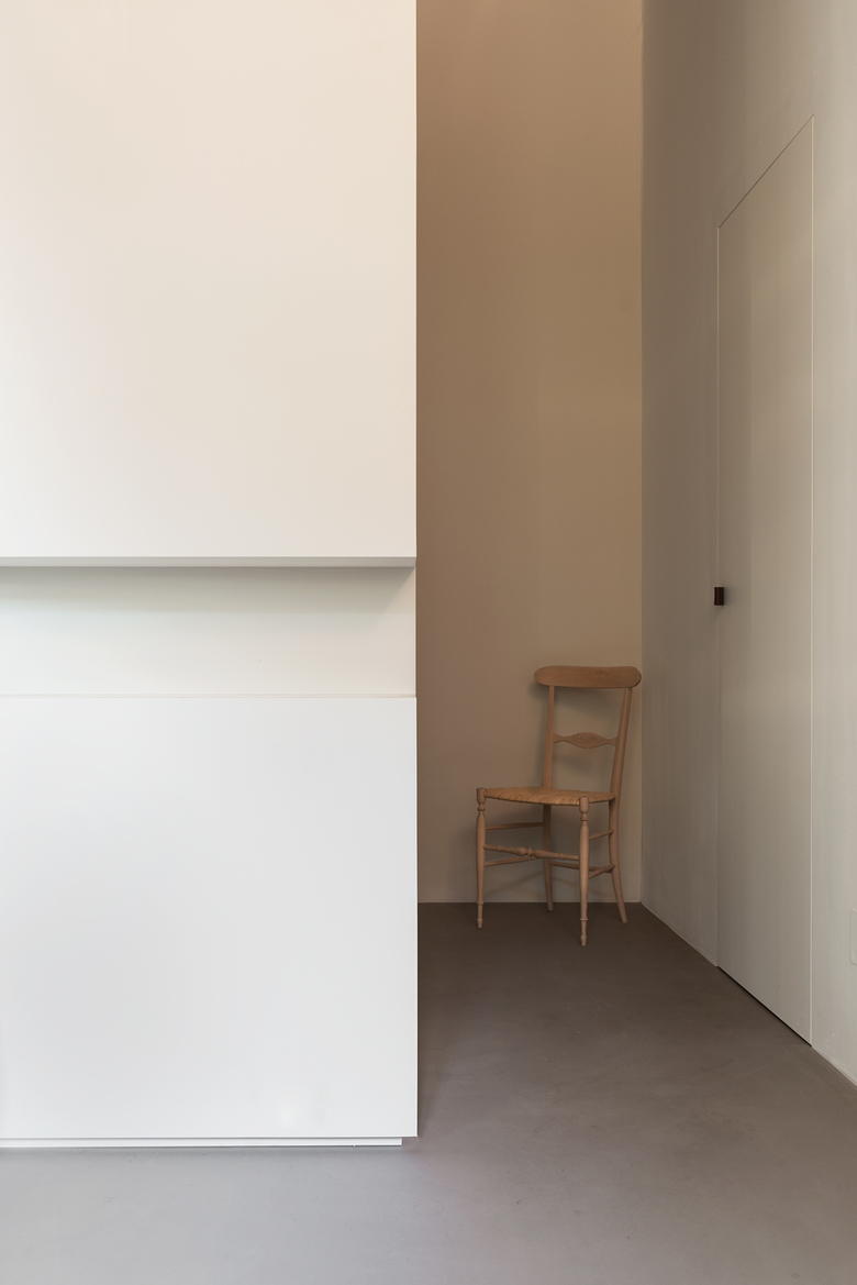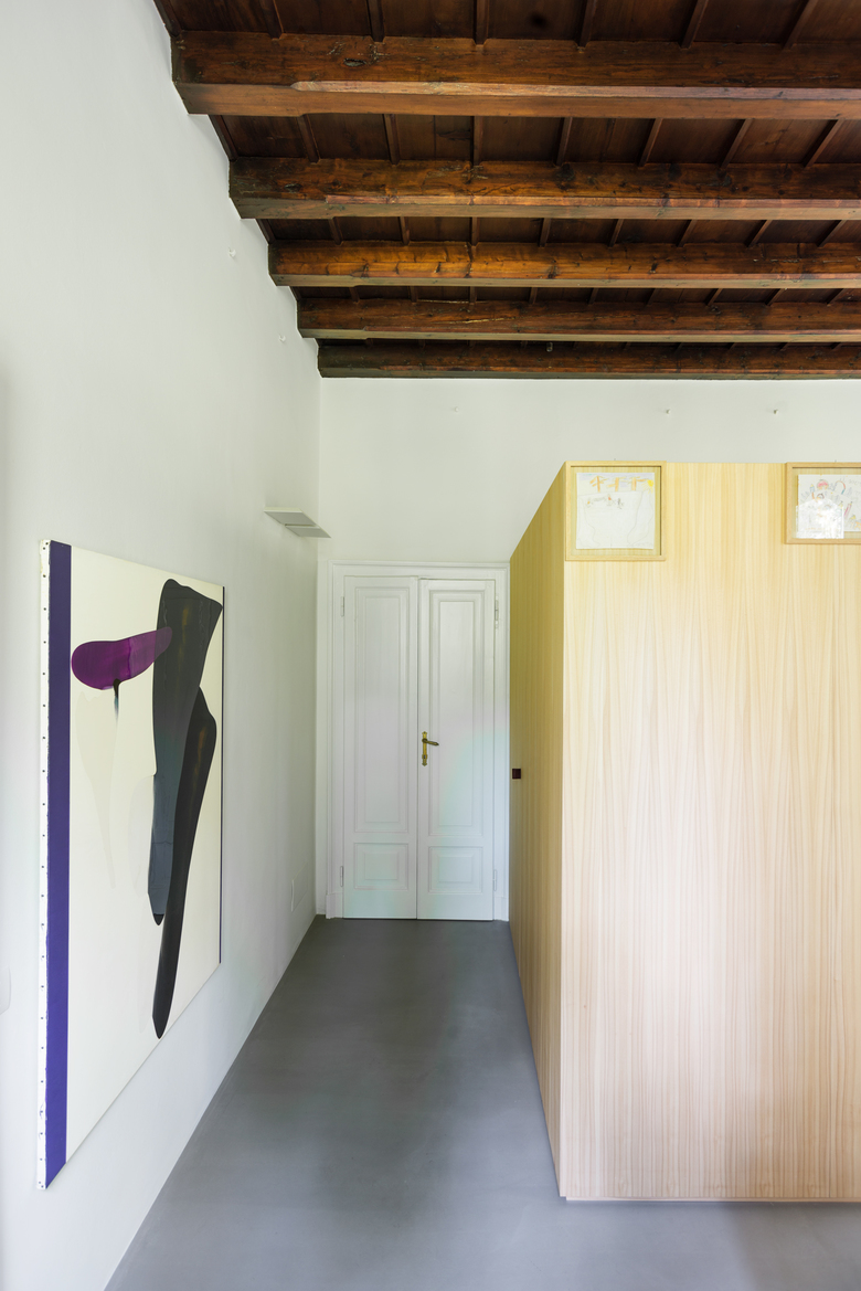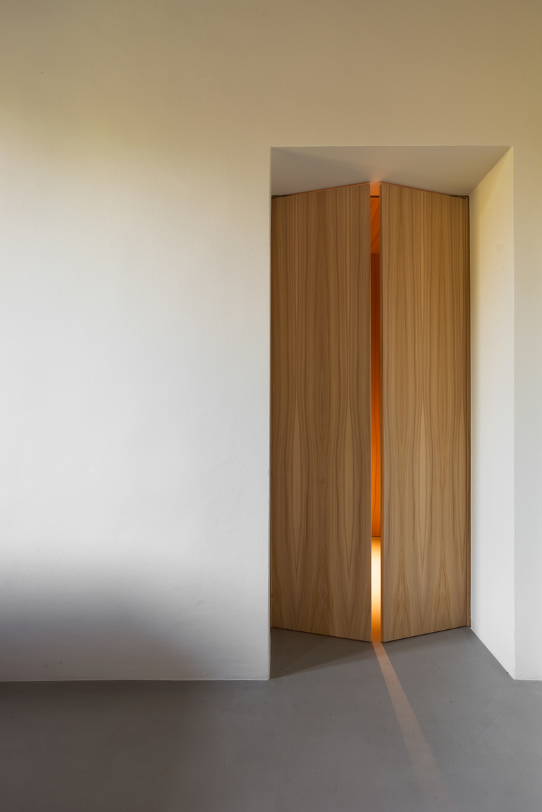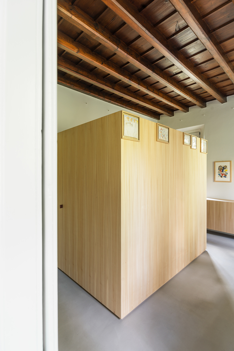 La morbida venatura verticale del legno di olmo ci accoglie all'ingresso. La ritroviamo poi nella biblioteca e nella cucina. Una materia bellissima e preziosa per il suo colore, per il suo disegno e per la sua età e di cui il cemento esalta la naturalezza.