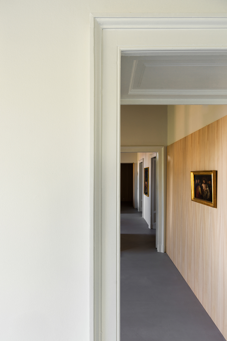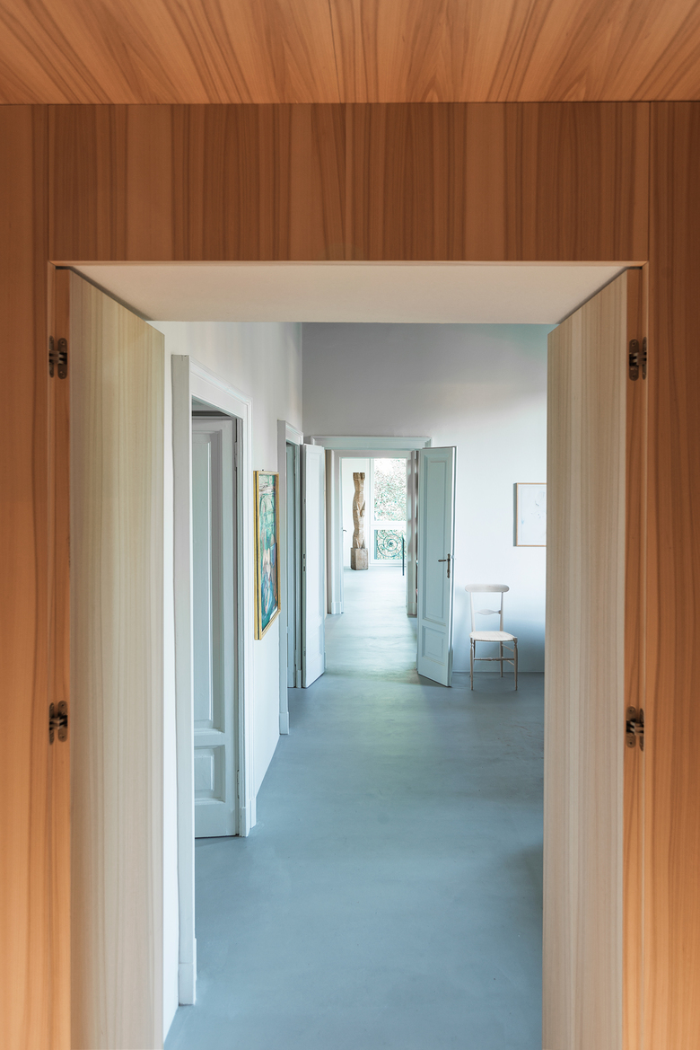 La pianta è governata da chiari assi lungitudinali e trasversali che attraversano le stanze fino a perdersi oltre le aperture nel verde dei giardini circostanti.