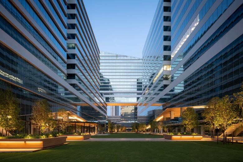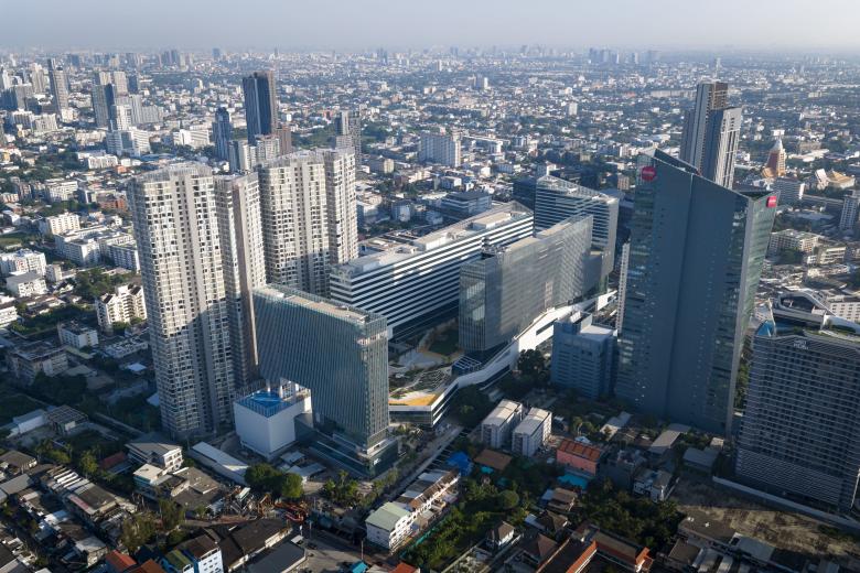 The design takes cue from Bangkok’s layered urban fabric, with a massing that responds to local climate conditions through iterative environmental wind and solar engineering. In contrast to the city’s ubiquitous vertical towers, the 250,000 m² development was conceived as an architecture of horizontality, blurring the boundaries between architecture and urbanism. Its diverse programs are organized around an open-air courtyard – the social and climatic heart of the project. Nestled between the tower and podium, the elevated courtyard serves as an innovative response to Bangkok’s flood-prone, heat-intense climate, providing passive shading and natural ventilation.