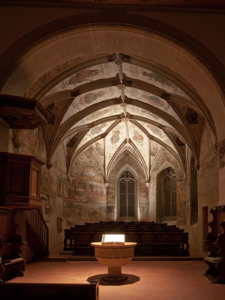 Die 1514 erbaute Kirche in Wiesendangen gehört zum Inventar der kantonalen Schutzobjekte. Die spätmittelalterlichen Fresken im Chor der Kirche werden präzise beleuchtet und treten in der Gesamthelligkeit gegenüber dem Kirchenschiff in den Vordergrund. Ziel der Beleuchtung des Kirchenschiffs ist, das Beleuchtungsniveau anzuheben, so dass bessere Sehbedingungen erreicht werden. Mit den eingesetzten Leuchten können verschiedene Lichtstimmungen erzeugt werden, die in der Liturgie verwendet werden können. Alle baulichen Eingriffe werden auf ein Minimum reduziert um denkmalpflegerischen Überlegungen gerecht zu werden.