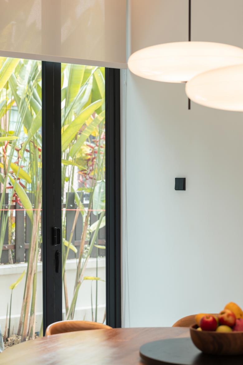 Das Lichtdesign von Studio Nimmersatt verstärkt diese Wirkung: Verdeckte LED-Leisten, gezielte Spots und dimmbare Zoneninszenierungen schaffen je nach Tageszeit unterschiedliche Raumbilder – von funktional bis stimmungsvoll. In das durchdachte Gestaltungskonzept fügen sich auch die Bedienelemente von JUNG ein. Zum Einsatz kommt die Schalterserie LS 990 in Schwarz, die sich dezent in die reduzierten Innenräume einfügt. In Bereichen mit höheren Anforderungen an Lichtsteuerung und Szenengestaltung wurden zusätzlich KNX-F-50-Taster verbaut.