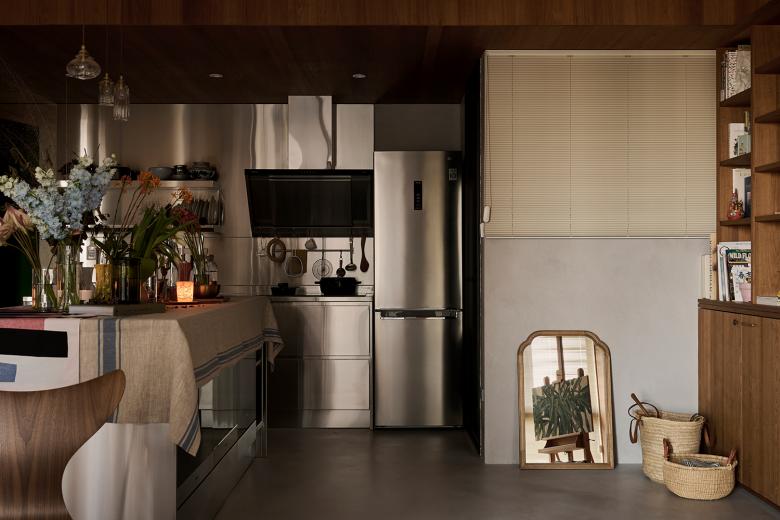 Kombination aus Holzoberflächen und holzverkleideten Einbauten, Wandflächen mit Mineralfarben, der Einsatz von Glas und Edelstahlflächen schafft eine natürliche und warme Atmosphäre. Die homogenen Materialoberflächen wirken wie eine Leinwand, während eine Auswahl an traditionellen Möbeln, Kunstwerken, Büchern und Accessoires des Eigentümers den Raum mit Spuren des Lebens füllen. Farben und Formen der Möbel und Leuchten reichen von den 1960er Jahren bis zu zeitgenössischem minimalistischem Design. Passend zum gehobenen Anspruch wurde die Wohnung mit dem JUNG Schalterklassiker LS 990 in Alpinweiß ausgestattet.
