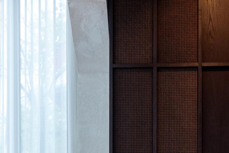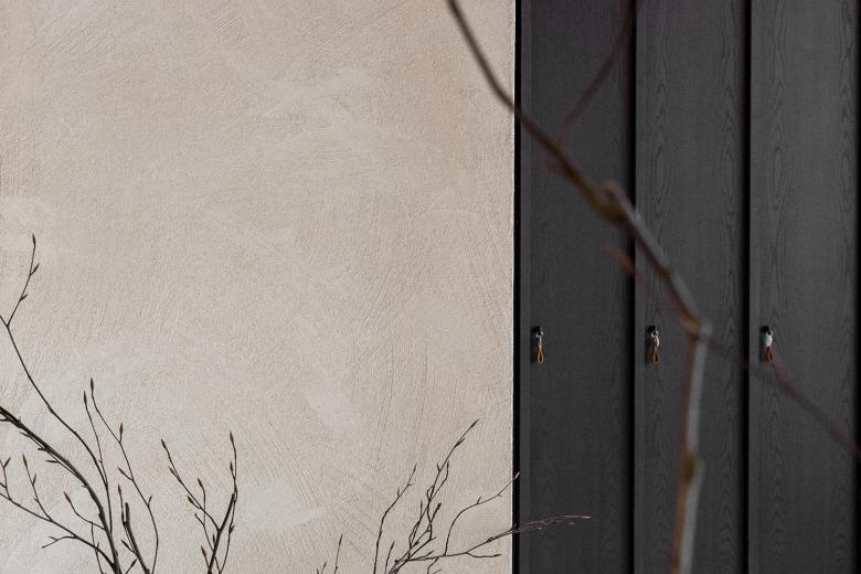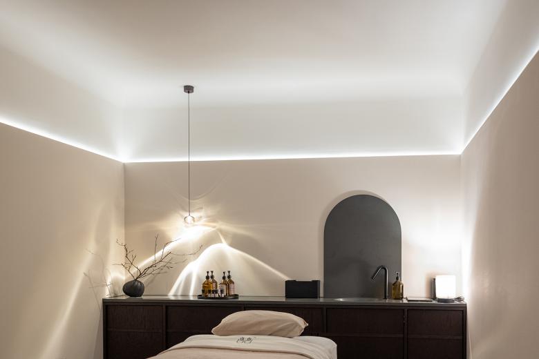 Die Gestaltung basiert auf einem fein abgestimmten Material- und Farbkonzept: Helle Putzflächen treffen auf terrazzoartige Böden, dunkles Holz und schwarze Akzente. In den Behandlungsräumen sorgt eine reduzierte Formensprache für eine beruhigende Atmosphäre. Bogenförmige Wandöffnungen und fließende Raumfolgen betonen das Gefühl von Geborgenheit und Rückzug. Das Zusammenspiel aus natürlichen Texturen und handwerklich veredelten Oberflächen erzeugt eine haptische Wärme. Dunkles Holz, graphitschwarze Details und textile Elemente bilden Kontraste zu den hellen, mineralischen Flächen. Eine präzise Lichtführung akzentuiert die Raumeindrücke – mal indirekt, mal fokussiert.