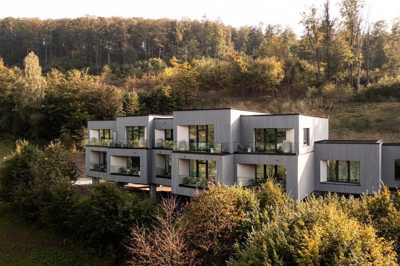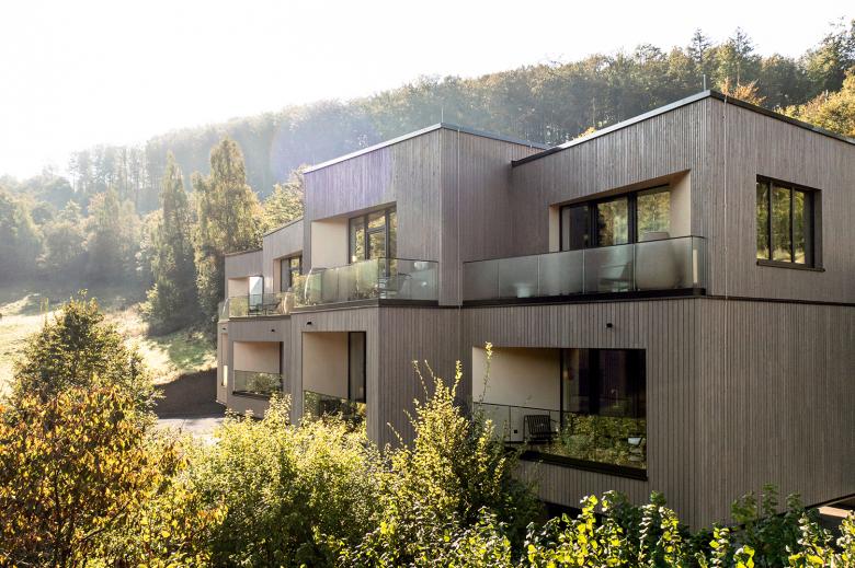 Die Suiten ruhen auf einer Stahlbetonkonstruktion über einem bestehenden Parkplatz – eine ressourcenschonende Lösung, die zusätzliche Flächenversiegelung vermeidet. Darüber erhebt sich ein zweigeschossiger Holzrahmenbau mit Brettstapeldecken. Verkleidet mit vorvergrauter heimischer Lärche, gliedern Vor- und Rücksprünge die Baukörper plastisch und gewähren den Gästen ein hohes Maß an Privatheit. In der Hanglage scheint die Architektur förmlich aus dem Gelände zu wachsen – selbstverständlich, ruhig und beinahe schwebend.