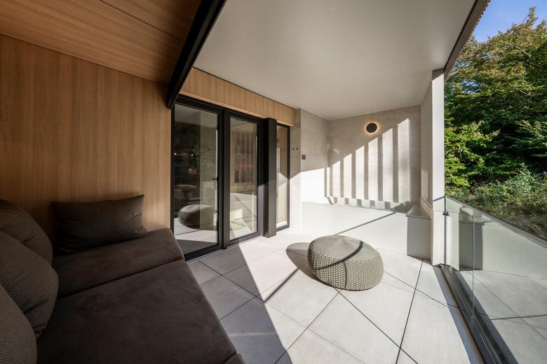 Jede Suite umfasst rund 100 m² und erstreckt sich über zwei Ebenen. Ein großzügiger Wohnbereich mit Loggia, Teeküche und Gästebad befinden sich im Erdgeschoss; Schlafraum, zweite Terrasse und ein privates Spa-Bad im Obergeschoss. Sauna, Infrarot-Sauna, Dampfdusche, freistehende Badewanne und eine Whirlpool-Loggia schaffen einen exklusiven privaten Wellnessbereich – stets mit Blick in die Bergwälder des Südharzes.