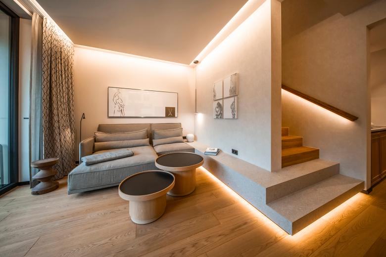 Das Interior Design ist von zurückhaltende Eleganz geprägt. Helle Beige- und Grautöne, natürliche Materialien wie Holz und Naturstein sowie individuell kuratierte Möbel schaffen eine hochwertige Atmosphäre. Standardlösungen wurden bewusst vermieden. Für die Ausstattung der Suiten fiel die Wahl auf Schalter und Steckdosen von JUNG in Aluminium Dark. Die Oberfläche besteht aus eloxiertem Aluminium, das in einem aufwendigen Verfahren veredelt wurde. Dadurch erhält das Material nicht nur seine markante, tiefdunkle Anmutung, sondern auch eine hohe Widerstandsfähigkeit im täglichen Gebrauch. Mit ihrer klaren Formensprache und der edlen Haptik setzen die Schalter dezente, aber wirkungsvolle Akzente im Interieur.