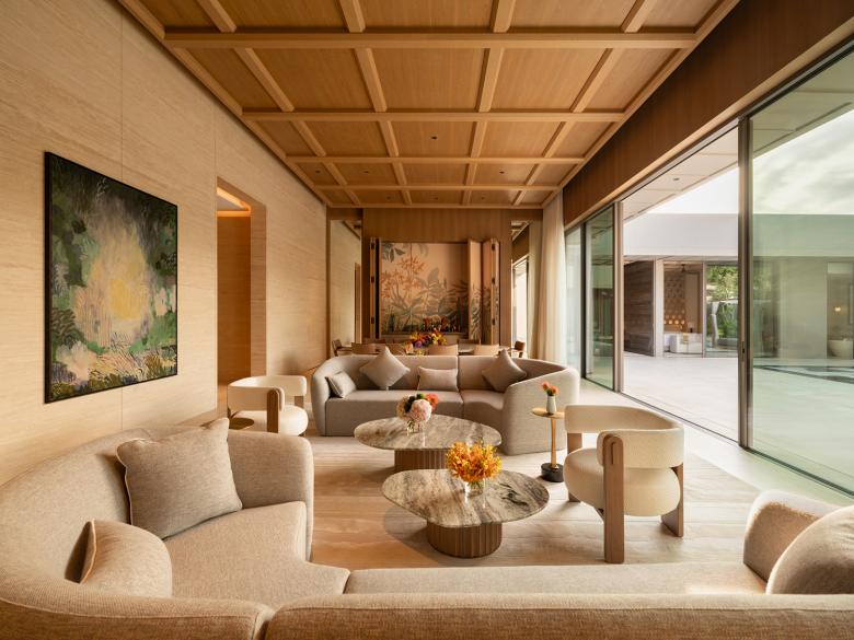 Die vom internationalen Designstudio Yabu Pushelberg verantwortete Gestaltung folgt einem organischen Grundriss, der die Gäste vom Empfang über die gemeinschaftlichen Bereiche bis zu den privaten Villen führt. Dabei taucht man mit jedem Schritt tiefer in die grüne Umgebung ein. Die Architektur verbindet klare Formen mit natürlichen Materialien. Travertin, helle Hölzer und handwerkliche Details prägen das Erscheinungsbild. Die Farbpalette ist zurückhaltend gewählt: Beige, Sand, Steingrau und helle Brauntöne dominieren. In Kombination mit maßgefertigten Möbeln und Kunstwerken lokaler Künstler entsteht eine ruhige, beinah private Atmosphäre. Große Glasflächen öffnen die Räume zum Garten. Jedes Gebäude ist als abgeschlossene Einheit mit eigenem Pool und Terrasse geplant. Die Übergänge zwischen Innen- und Außenbereich sind fließend. Textile Elemente, Lichtreflexionen und der Blick ins Grüne schaffen eine Atmosphäre, die sich konsequent den Themen Rückzug und Entschleunigung widmet.