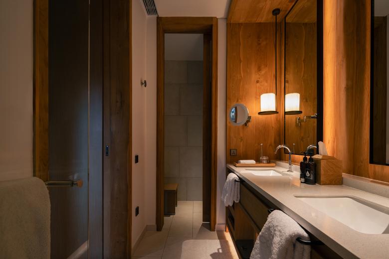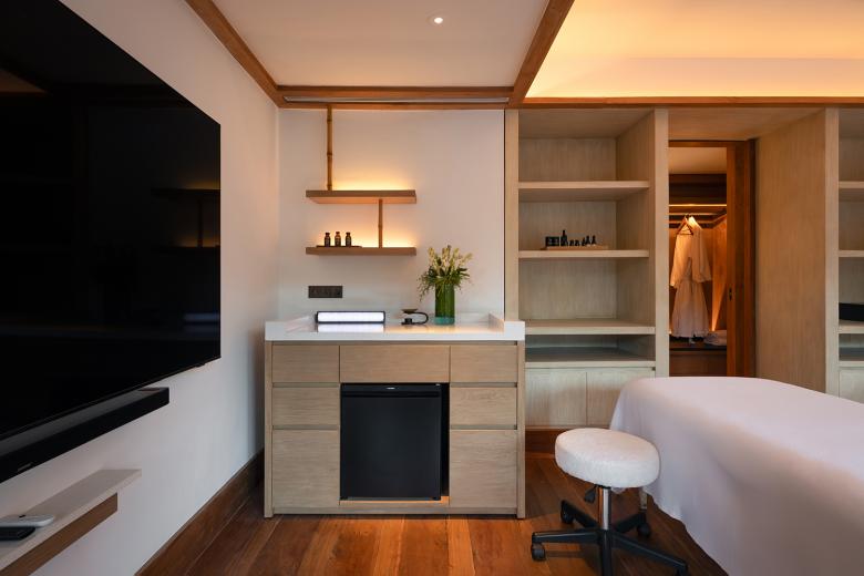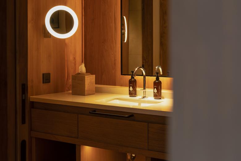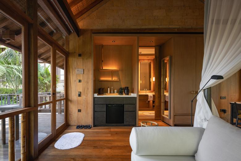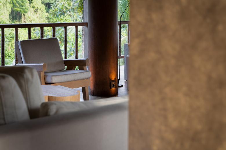 Schon der Name „Wald im Nebel“ beschreibt die Atmosphäre: ruhig, geerdet, umhüllt von tropischer Feuchte und vom Duft des Dschungels. Das von dem Designstudio Atelier Ikebuchi gestaltete Interieur spiegelt die Philosophie der gesamten Anlage wider: ganzheitlich, achtsam und mit tiefem Respekt vor Ort und Kultur. Natürliche Materialien wie Teakholz, Bambus und Eisenholzschindeln prägen die Architektur. Weiche, weiße Stoffe verleihen den Räumen Leichtigkeit und Beweglichkeit, während klassische balinesische Elemente Identität schaffen. So entsteht ein Ort, der sich nicht in die Landschaft stellt, sondern sich mit ihr verbindet. Durch die großen Fenster öffnet sich der Blick auf das dichte Blätterdach des Waldes, durchzogen vom Rauschen des Ayung-Flusses. Licht, Luft und Ruhe fließen ungehindert durch die Räume. Die Lichtplanung von Nipek, die gezielt Schatten und Akzente setzt, um die Stimmung des Hauses zu unterstreichen, unterstützt dieses Wechselspiel. Dezent in die natürliche Umgebung eingebettet sind auch die technischen Lösungen. Die eingesetzte KNX-Gebäudetechnik sorgt für intuitiven Komfort, ohne sichtbar in Erscheinung zu treten. Die Schalter und Taster der Serie LS 990 in der Farbe Lackiertes Mokka fügen sich mit ihrer reduzierten Formensprache und ihrer warmen Oberfläche mit sanftem Glanz harmonisch in das architektonische Gesamtbild ein. Auch Steckdosen und Bedienelemente greifen diesen Ton auf und bleiben dabei funktional und zurückhaltend.