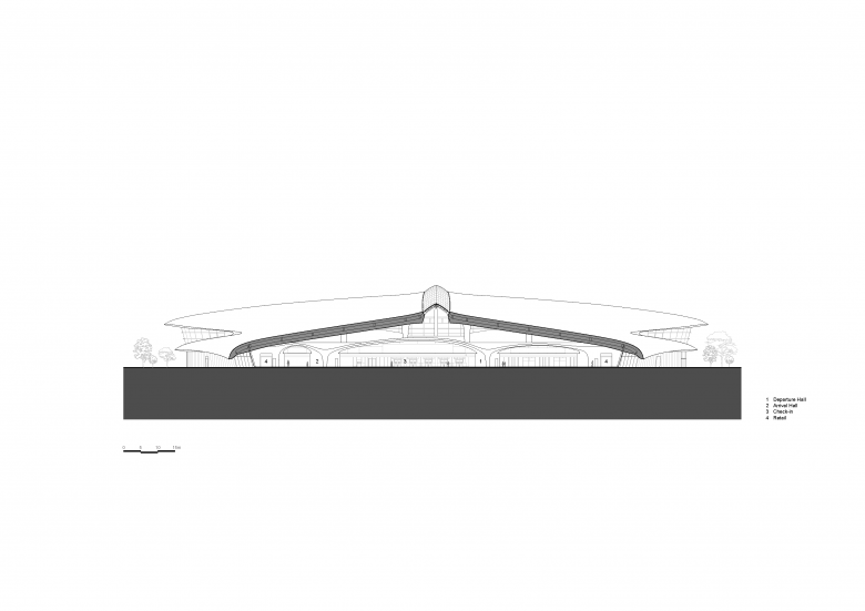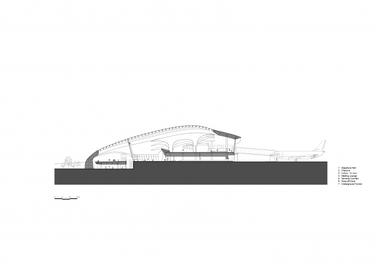 Below the terminal, a sunken parking structure follows the natural terrain. A landscaped central promenade runs beneath the building, guiding passengers intuitively towards the departure hall and resolving the challenges posed by the mountainous site through architectural continuity rather than separation.