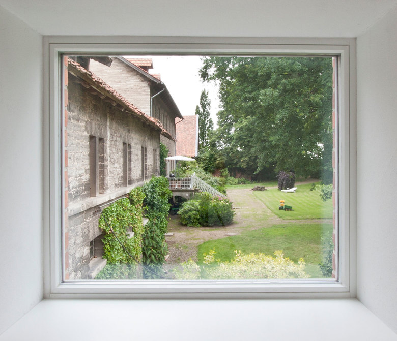 Gezielte Ausschnitte aus der Umgebung werden über die Fenster wie Landschaftsbilder festgehalten, ebenso wie der Ausblick auf den Garten des Gutshofes und die Schafe, deren Weide direkt an das Gebäude angrenzt.