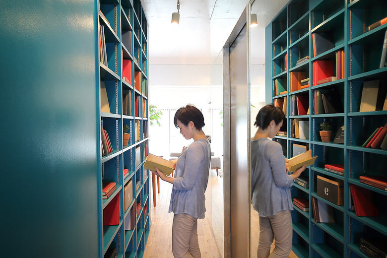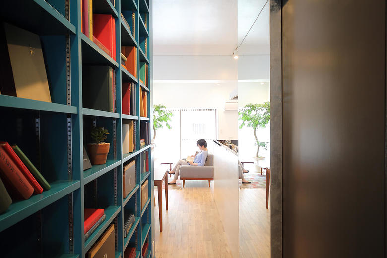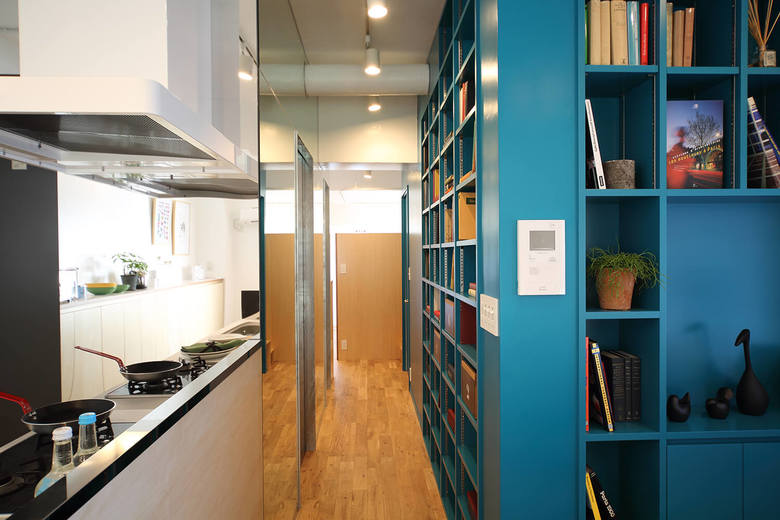 築26年の中古マンションの一棟フルリノベーションのモデルルーム。このマンションの専有部の中でも最も幅が狭い区画でどのように広がりを持たせることができるかをテーマとして設計しました。プランは中央に洗面、バスルーム、トイレ、などの水まわりが集中し、全体が大きく2つに分かれています。バスルームと洗面が入ったボックスの壁の一部に本棚を設け、落ち着いたターコイズブルーで塗装し、区画全体のアクセントとなっています。その反対側にはトイレとウォークインクローゼットが入ったボックスがあり、ミラー仕上げとなっています。このミラーはボックスの存在感を消すだけでなく、周りをを写し込むことで、狭いスペースに開放感を持たせています。リビングダイニングと反対側のスタディ、下部が収納となった上げ床のベッドスペース、マルチスペースの間には間仕切りがないですが、ボックスで視線を遮ることで、個々のスペース間の距離感を保っています。
