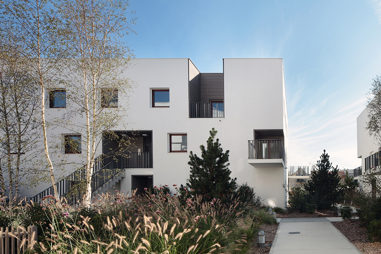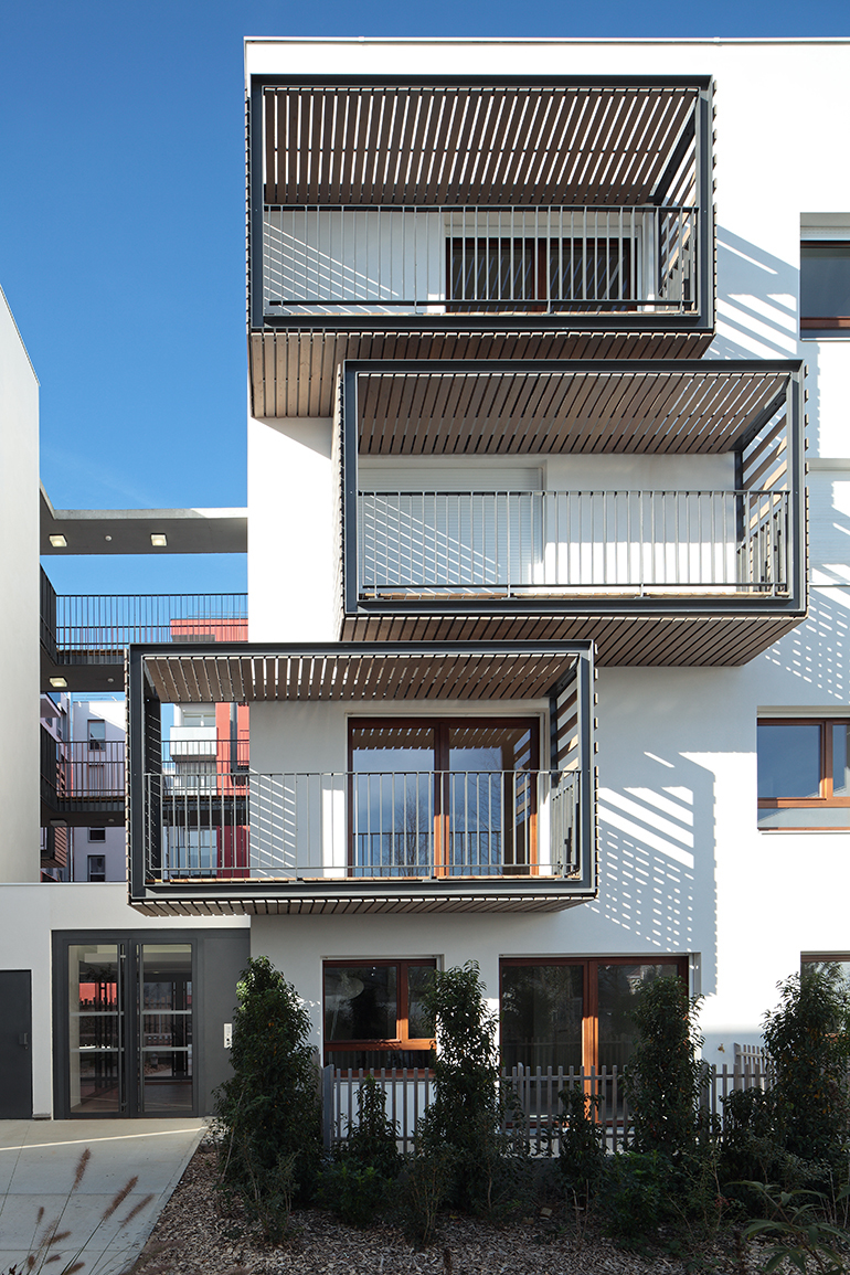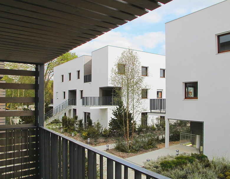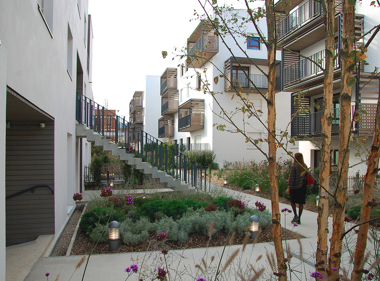 The entire Eco Quartier aims to promote social cohesion among new residents and existing neighbours in the district through the variety of housing types and the social profile of future residents. This is done by locating for-sale housing, rental and sale social housing and a residence for working young people, all in the same urban context. This diversity in types of housing includes — in this first phase of the project — residential units with direct access to common private gardens through exterior stairs and residential units connected by exterior passages that enhance vertical circulation while creating spaces for social contact. Efforts are thus focused on housing type diversification and cost optimisation to end up with a diversity of residents.