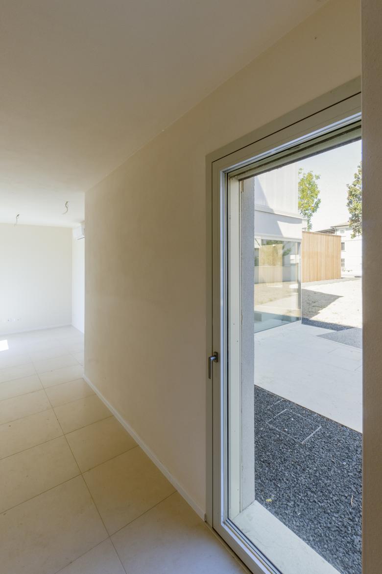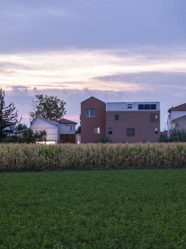 The facade on the open public space defines the access hierarchies while the rear front enriches the possible dialectics with the outside: the portions of the lower openings cuts out a fragment of the countryside, while the upper portion covered in polycarbonate, is configured as a lantern which, illuminated at night, it becomes an element of orientation in the surrounding agricultural fields context.