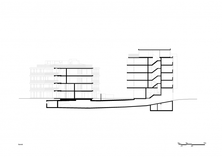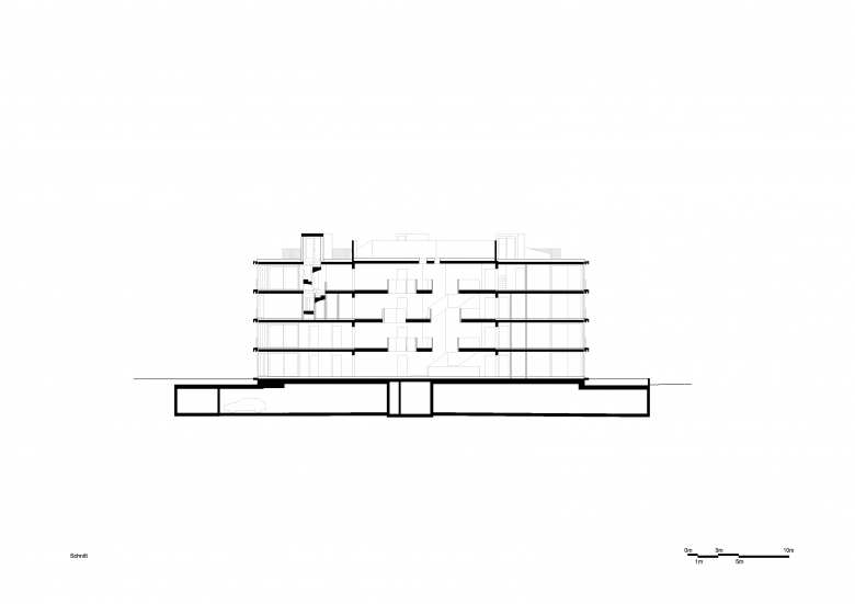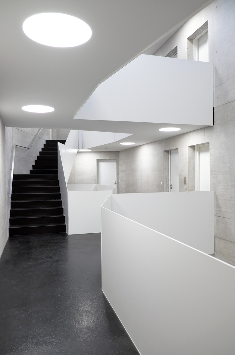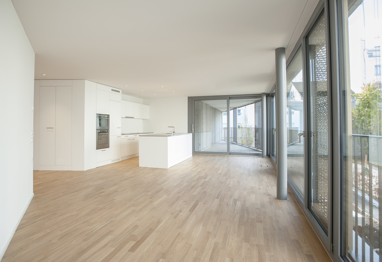 Die 43 Wohnungen sind attraktiv organisiert. Die durchgehenden Wohnungen haben aufgrund ihrer Geometrie eine hohe räumliche Qualität. Elf 3½ bis 5½ Zimmer-Wohnungen finden darin ihren Platz. Die Splitt-Level Erdgeschosswohnungen mit ihrem überhöhten Wohnraum verfügen über einen Gartenanteil.